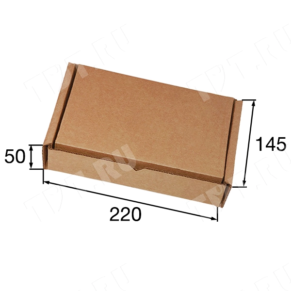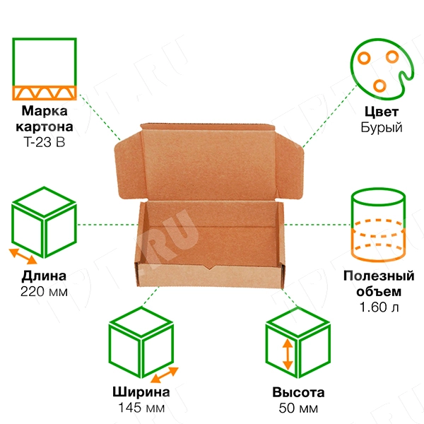 Короб КУ-11 бурый, длиной 220 мм, шириной 145 мм и высотой 50 мм. Изготовлен из трёхслойного картона Т-23 В. Полезный объём — 1.60 л.