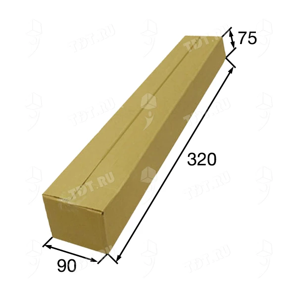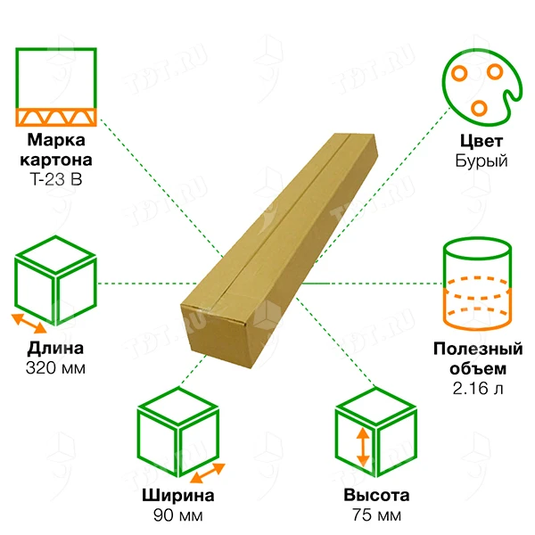 Короб К-133 бурый, длиной 320 мм, шириной 90 мм и высотой 75 мм. Изготовлен из трёхслойного картона Т-23 В. Полезный объём — 2.16 л.