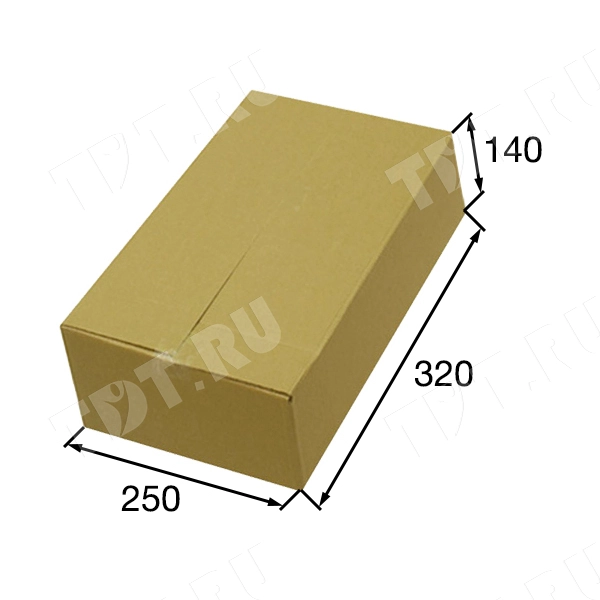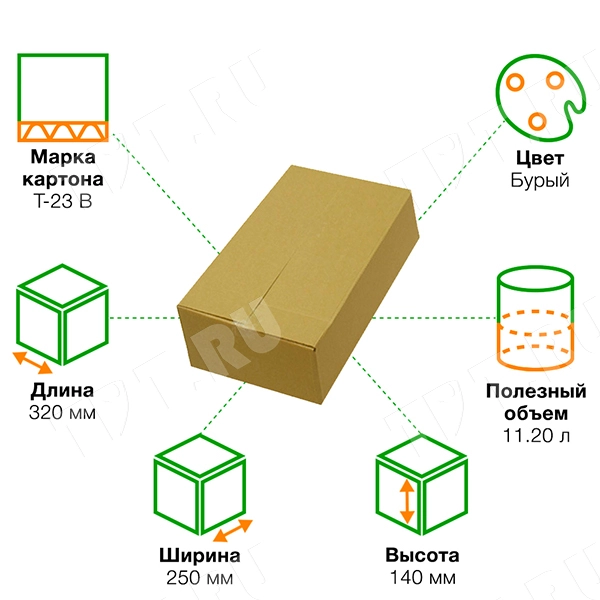 Короб К-181 бурого цвета, длиной 320 мм, шириной 250 мм и высотой 140 мм. Изготовлен из трехслойного картона марки Т-23 В. Полезный объём — 11.20 л.