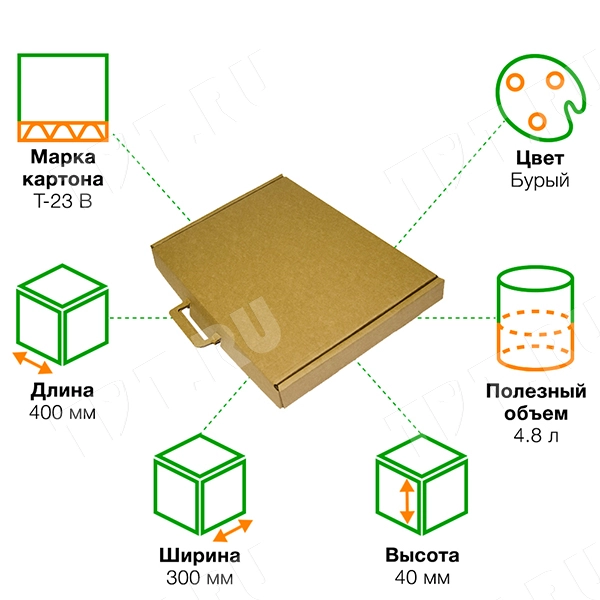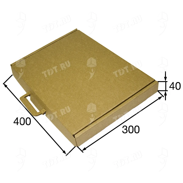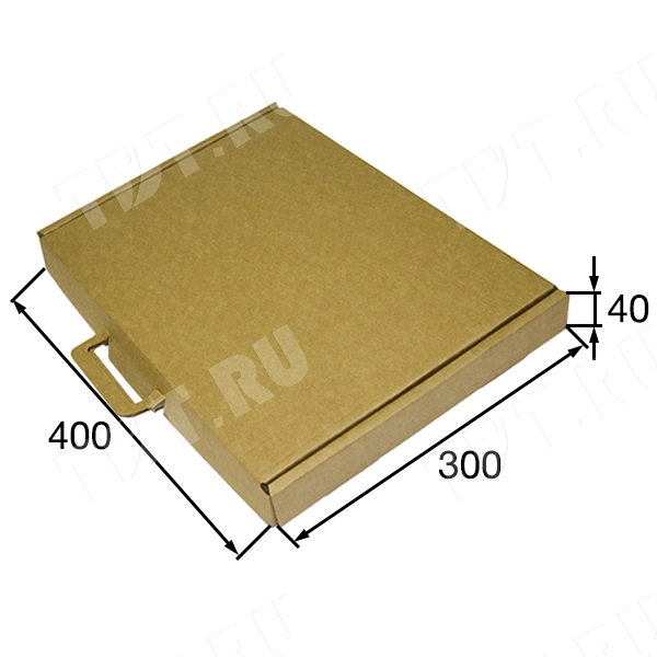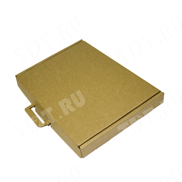 Короб-чемодан бурого цвета, длиной 400 мм, шириной 300 мм и высотой 40 мм. Изготовлен из трехслойного картона марки Т-23 В. Полезный объём — 4.8 л.