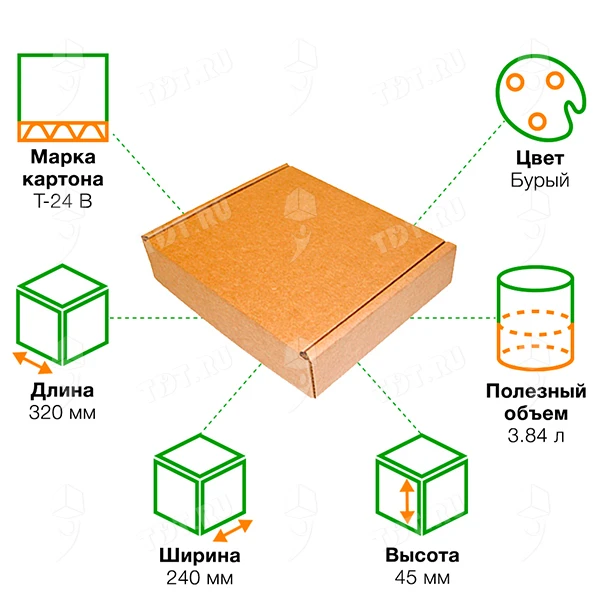 Короб КС-77 бурый, длиной 320 мм, шириной 240 мм и высотой 50 мм. Изготовлен из трёхслойного картона Т-24 В. Полезный объём — 3.84 л.