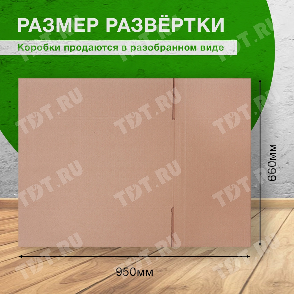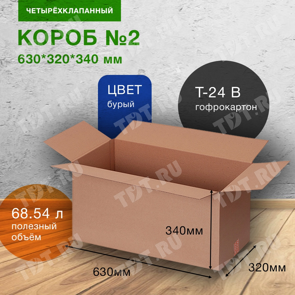 Картонный короб №2 (средний) длиной 630 мм, шириной 320 мм и высотой 340 мм. Короб изготовлен из трехслойного картона высокого качества Т-24 В. Полезный объём — 68.54 л.