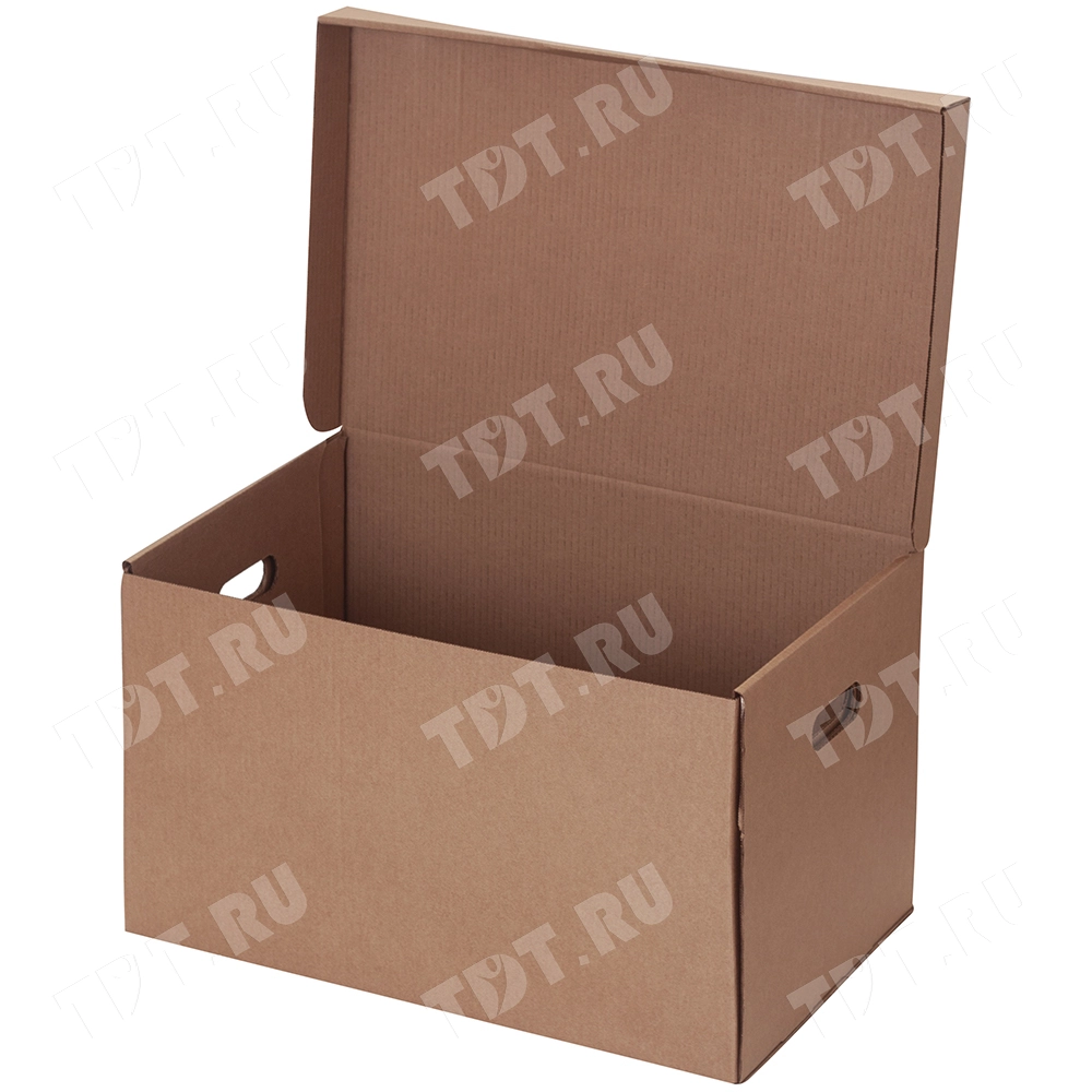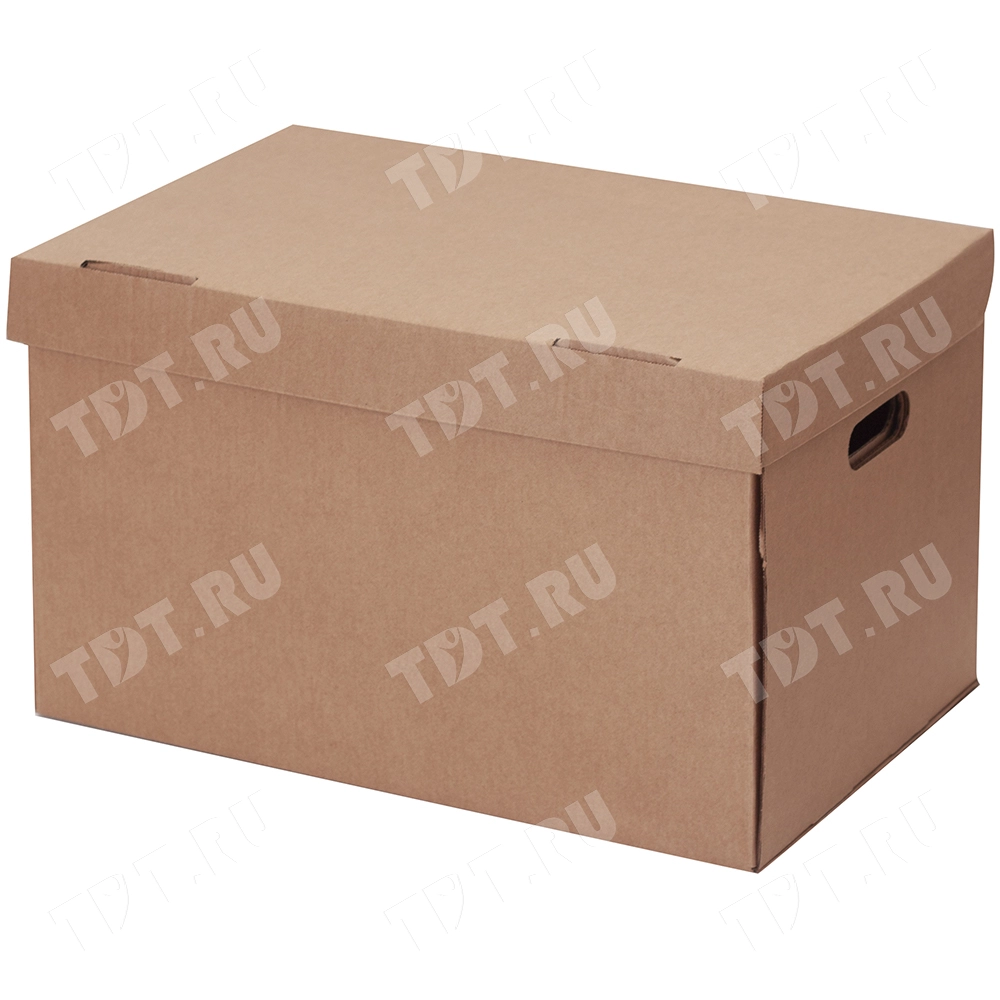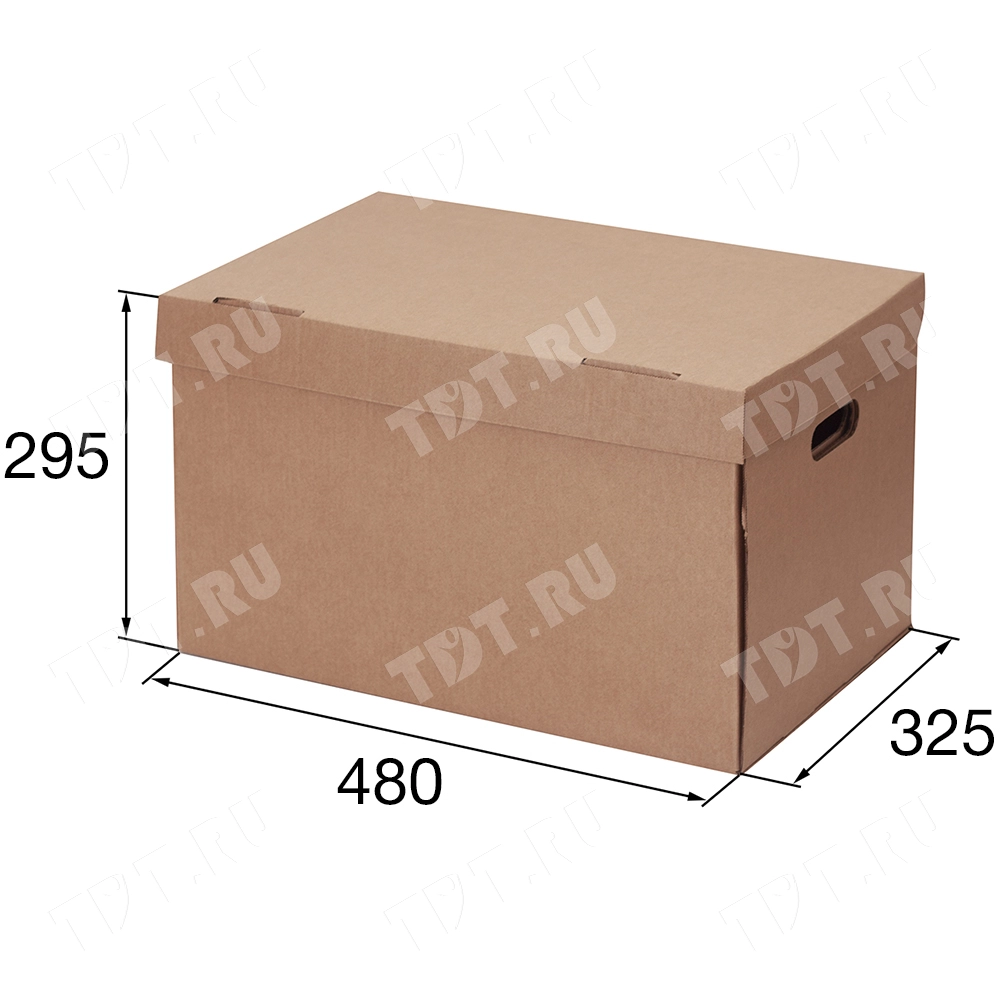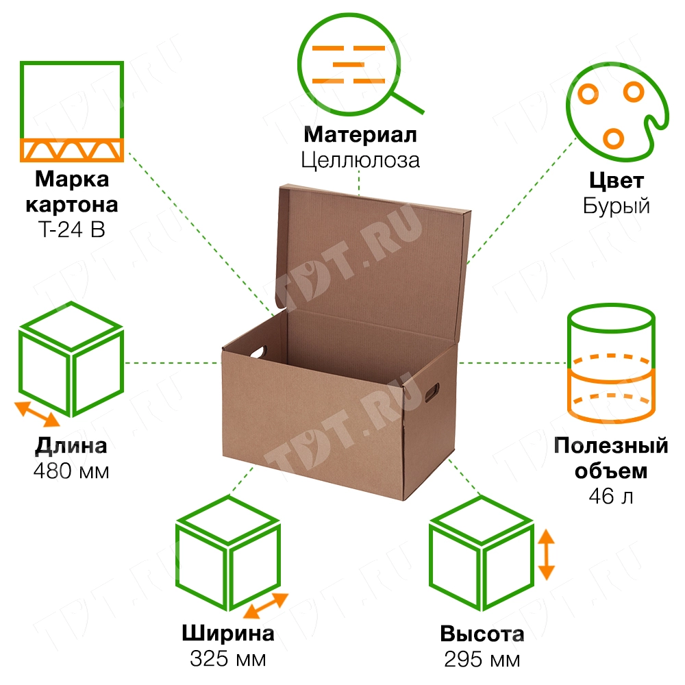 Короб архивный самосборный с крышкой, длиной 480 мм, шириной 325 мм и высотой 295 мм. Изготовлен из трёхслойного гофрокартона марки Т-24 В. Полезный объём — 46 л.