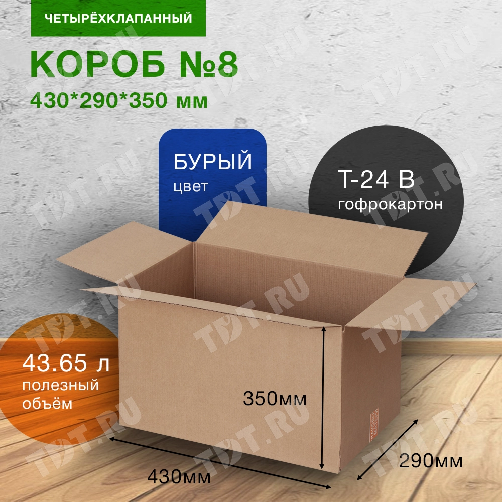 Картонный короб №8 для хранения вещей (стандарт), длиной 430 мм, шириной 290 мм и высотой 350 мм. Изготовлен из трехслойного картона марки Т-24. Полезный объём — 43.65 л.