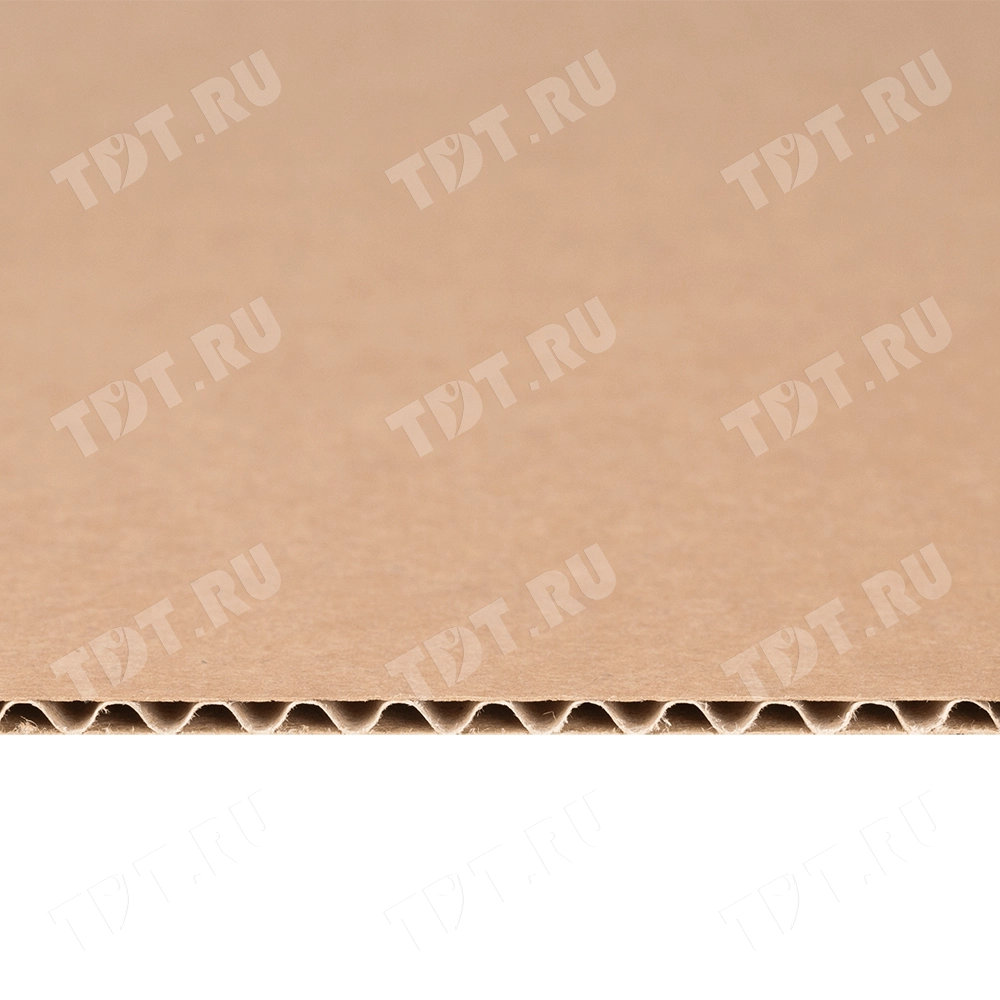 Трехслойный лист гофрокартона, бурого цвета марки Т-21 В, длиной 2060 мм, шириной 1200 мм, толщиной 2.5-3.2 мм, площадью 2.47 м², направление волны вдоль стороны 1200 мм. Производится в России.