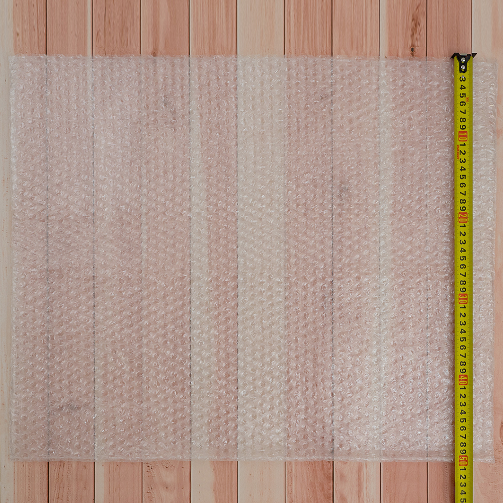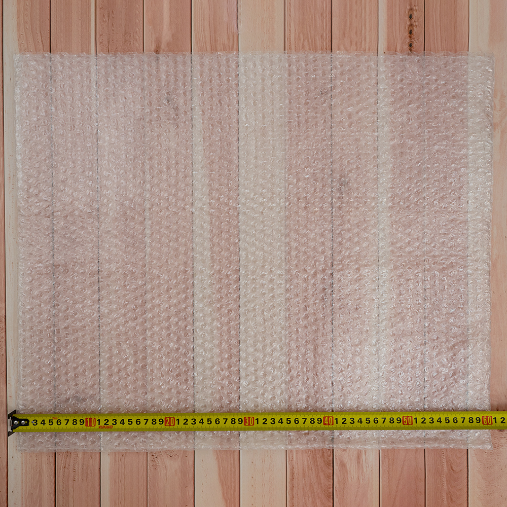 Большой прозрачный трехслойный воздушно-пузырчатый пакет Бета-Куверт, длиной 60 см, шириной 50 см, диаметром пузырька 10 мм, плотностью 60 г/м². Изготовлен из полиэтилена. Производится в России.
