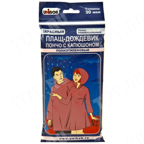 Плащ-дождевик пончо с капюшоном, полиэтиленовый Unibob, красного цвета, универсального размера, толщиной 30 мкм, весом 53 г. Материал – полиэтилен повышенной прочности. Производитель – Китай.