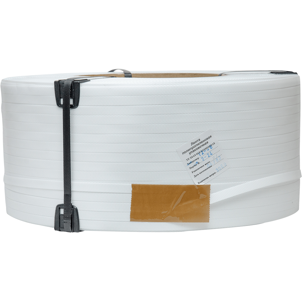 Упаковочная полипропиленовая лента (ПП) Лентапром, белого цвета, намоткой 3000 м, шириной 12 мм, толщиной 0.6 мм, усилием на разрыв 130 кГс, весом 10.75 кг, транспортировочным объемом 0.031862 м³. Диапазон рабочих температур от -30 до +60°C. Производится в России.