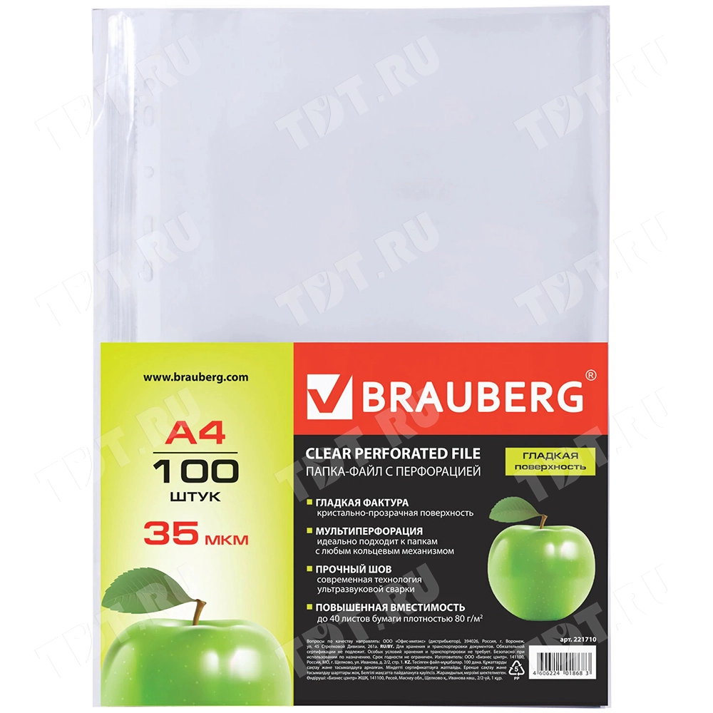 Папки-файлы с перфорацией BRAUBERG «Гладкое яблоко», формата А4, толщиной 35 мкм, прозрачного цвета, код производителя 221710, в упаковке по 100 штук. Производится в России.