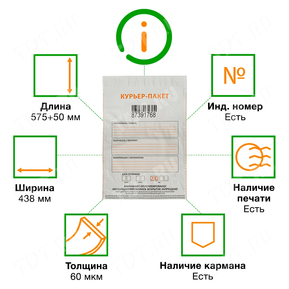 Курьер-пакет белый с печатью, с карманом, 438*575+50 мм, 60 мкм, 1 шт.