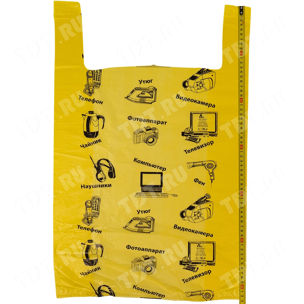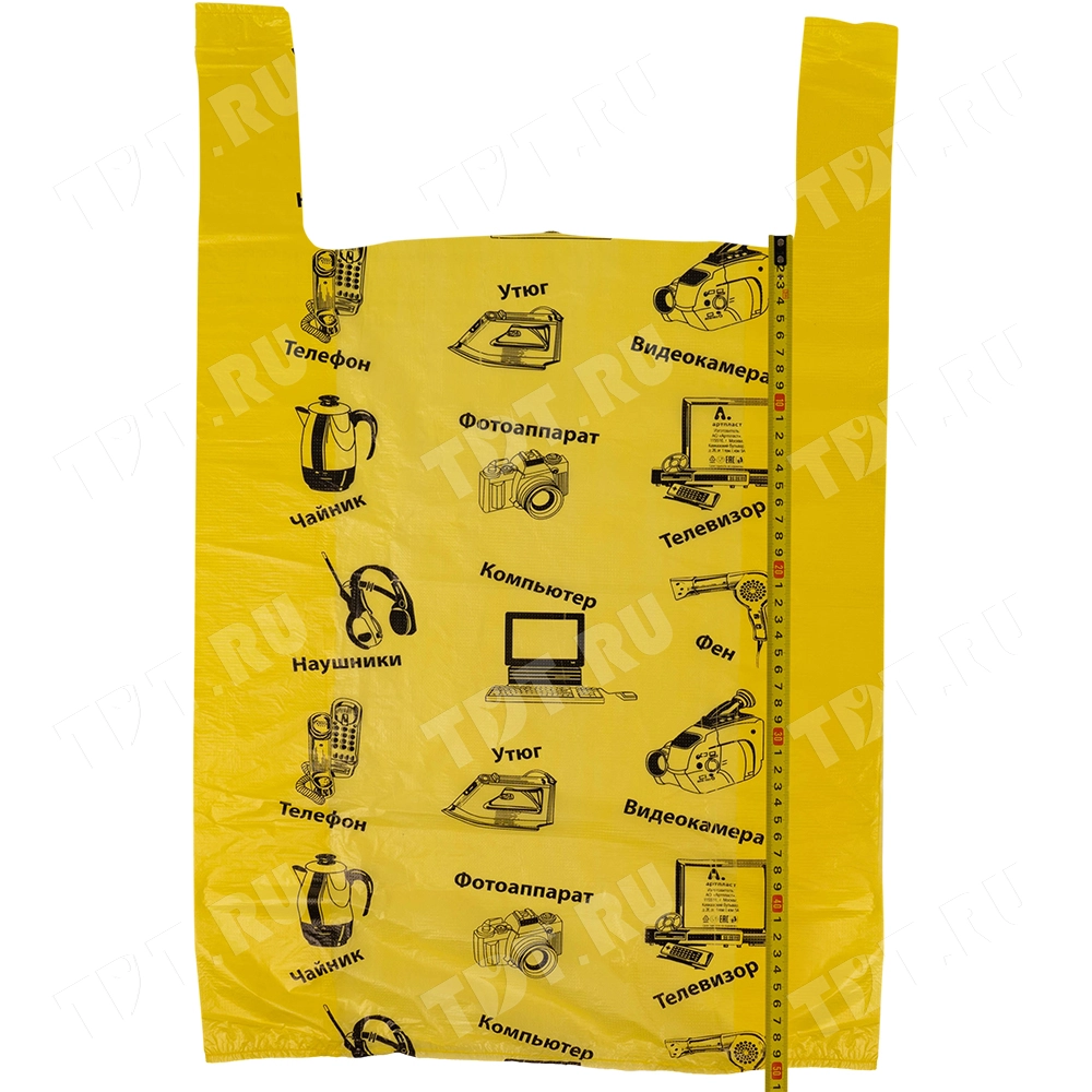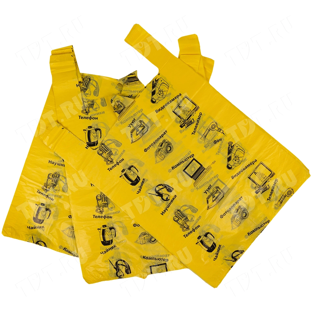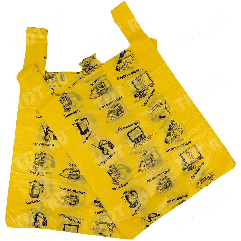 Полиэтиленовые пакеты майка ПНД «Электроника» с надписями, желтого цвета, длиной 64 см, шириной 43+20 см, толщиной 23 мкм, в упаковке 50 штук. Материал – полиэтилен низкого давления. Производятся в России.