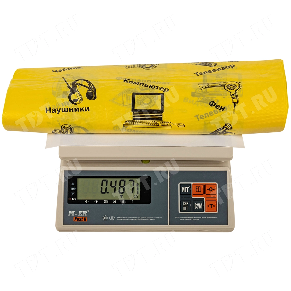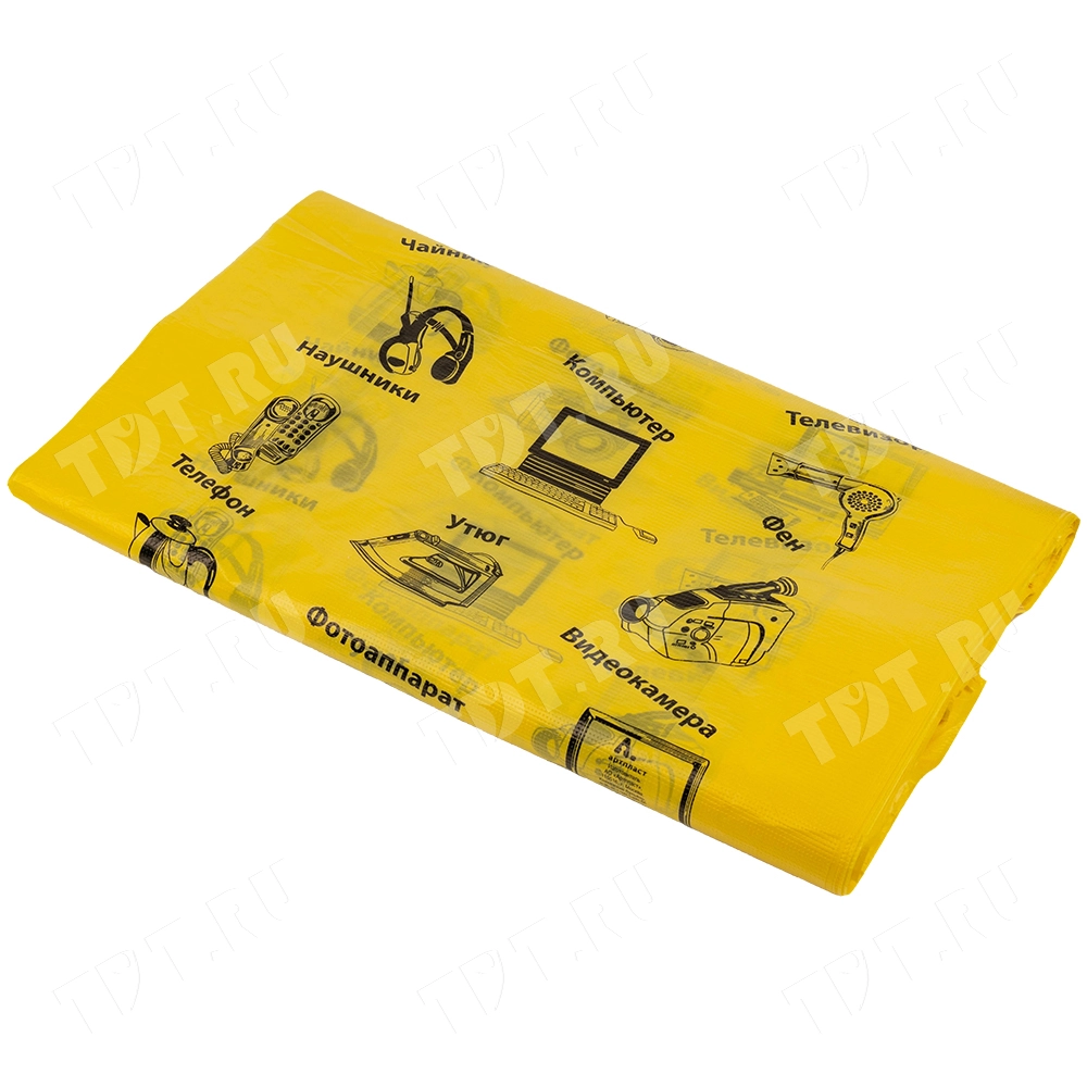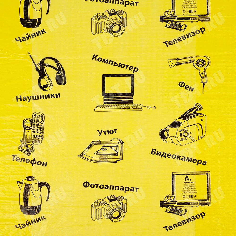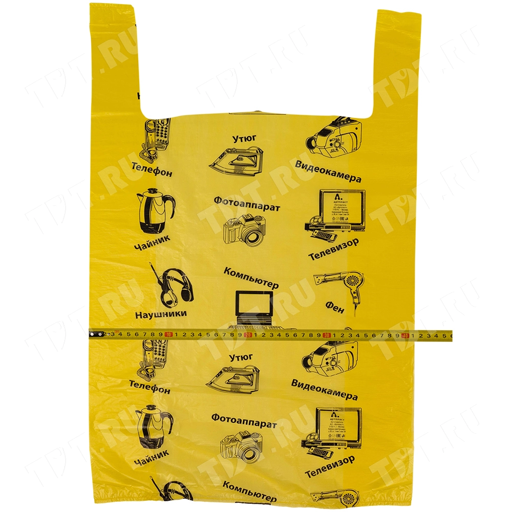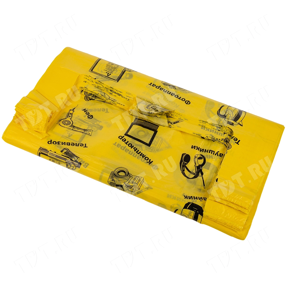 Полиэтиленовые пакеты майка ПНД «Электроника» с надписями, желтого цвета, длиной 64 см, шириной 43+20 см, толщиной 23 мкм, в упаковке 50 штук. Материал – полиэтилен низкого давления. Производятся в России.