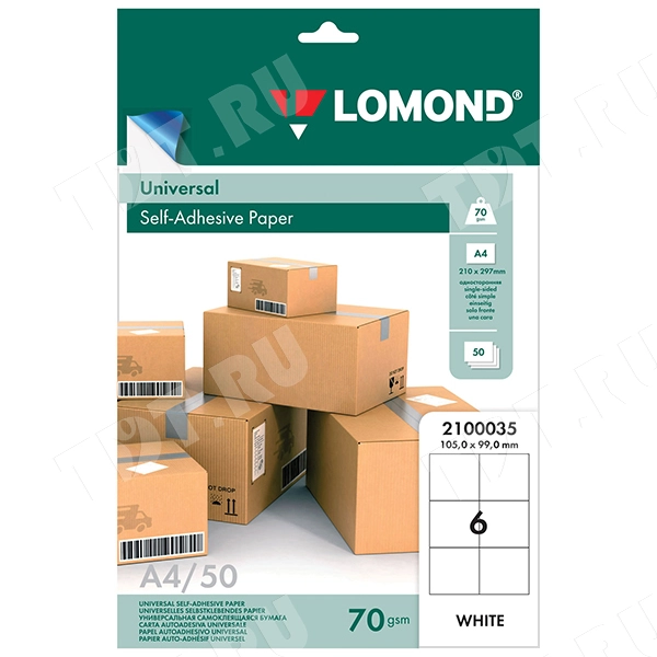 Самоклеящаяся бумага Lomond по 6 этикеток на странице (белого цвета), формата А4, длиной этикетки 105 мм, шириной этикетки 99 мм, в упаковке по 50 штук, весом 500 г. Производится в России.