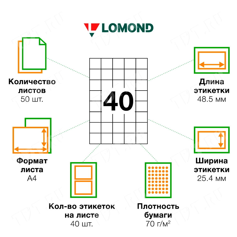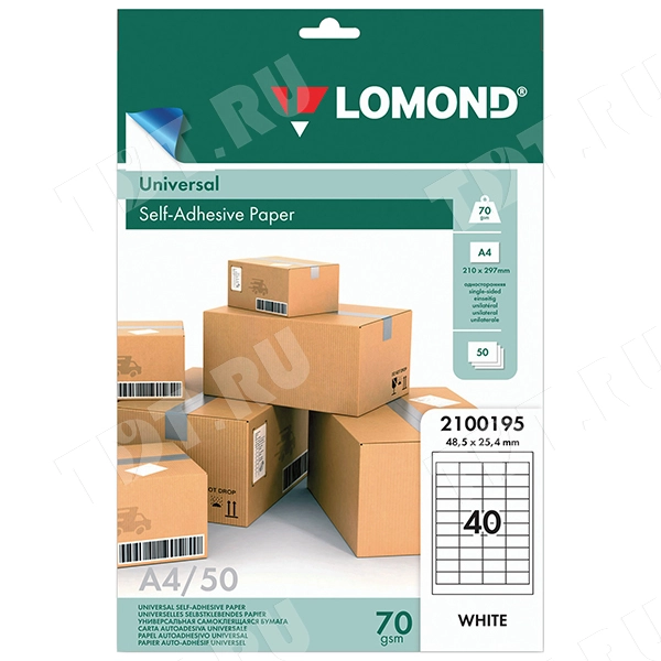 Самоклеящаяся бумага Lomond по 40 этикеток на странице (белого цвета), формата А4, длиной этикетки 48.5 мм, шириной этикетки 25.4 мм, в упаковке по 50 штук, весом 500 г. Производится в России.
