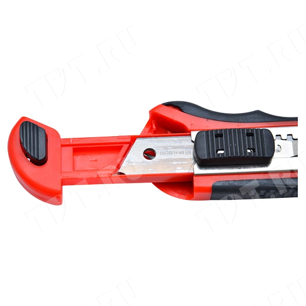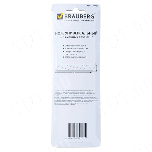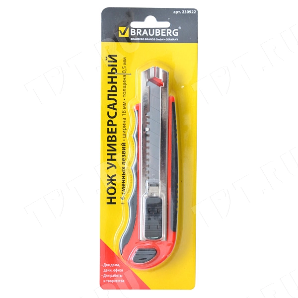 Универсальный нож Brauberg + 6 сменных лезвий, код производителя 230922, шириной 18 мм, толщина 0.5 мм, черно-красного цвета. Материал корпуса – пластик и резина. Продаются в картонной упаковке с европодвесом. Производится в России.
