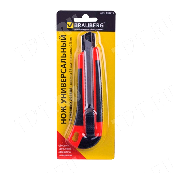 Универсальный нож Brauberg + 2 сменных лезвия, код производителя 230919, шириной 18 мм, толщиной 0.5 мм, черно-красного цвета. Материал корпуса – пластик и резина. Продаются в картонной упаковке с европодвесом. Производится в России.