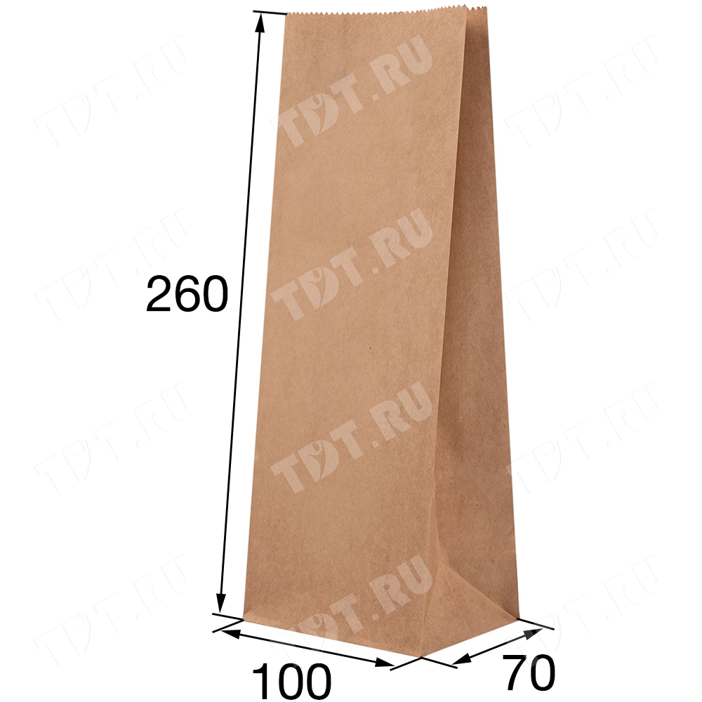 Бумажный крафт пакет без ручек шириной 70 мм, длиной 100 мм, высотой 260 мм изготовлен из экологичного материала. Пакеты производятся в России.