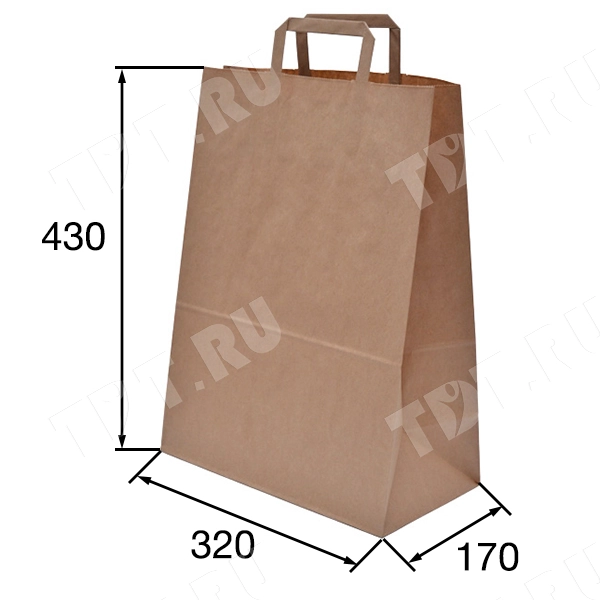 Бумажный крафт пакет с плоской ручкой шириной 170 мм, длиной 320 мм, высотой 430 мм изготовлен из экологичного материала. Пакеты производятся в России.