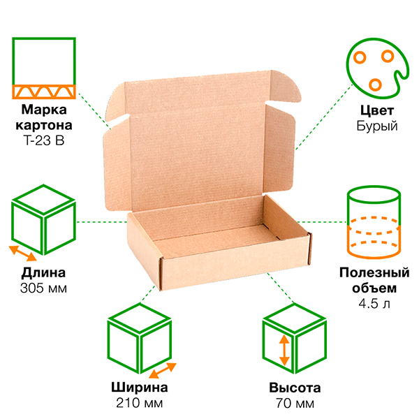 Короб №70 бурого цвета, длиной 305 мм, шириной 210 мм и высотой 70 мм. Изготовлен из гофрокартона Т-23 В. Полезный объём — 4.5 л.