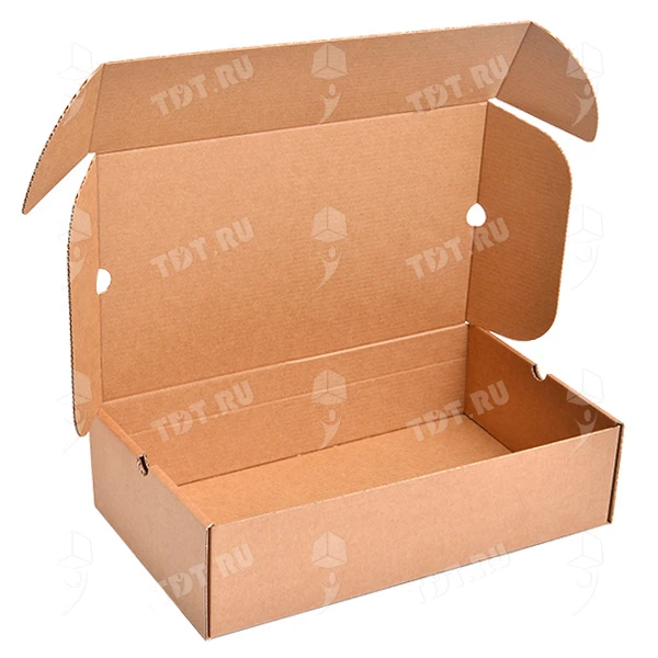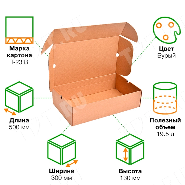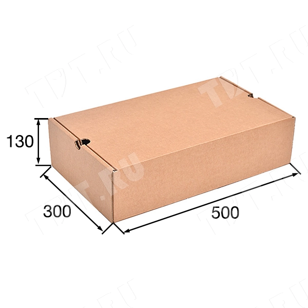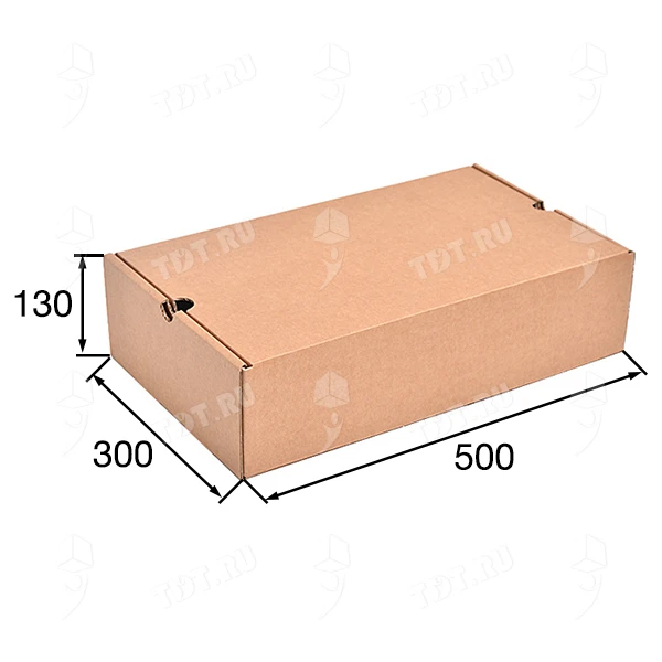Коробка для обуви №76 бурого цвета, длиной 500 мм, шириной 300 мм и высотой 130 мм. Изготовлена из трёхслойного картона Т-23 В. Полезный объём — 19.5 л.