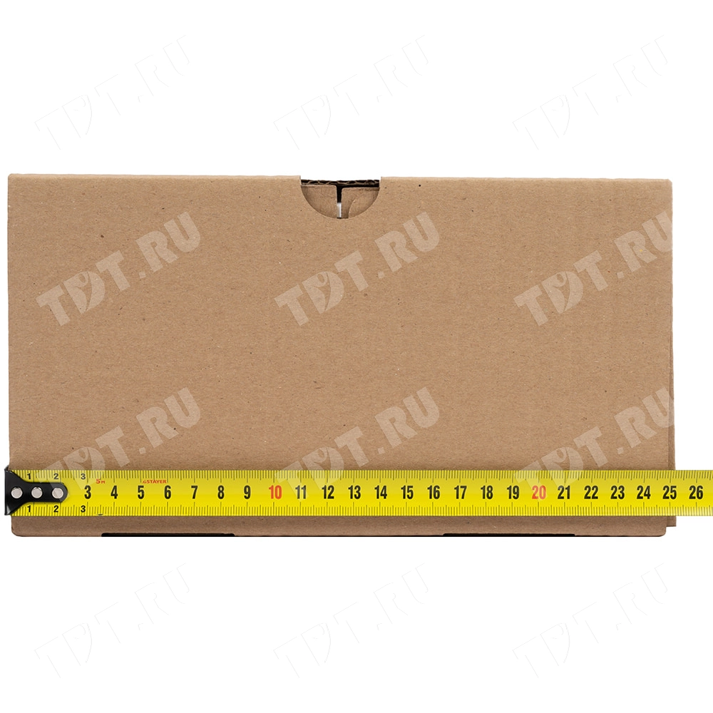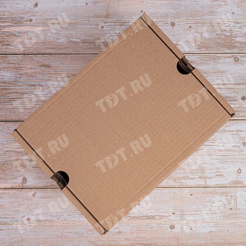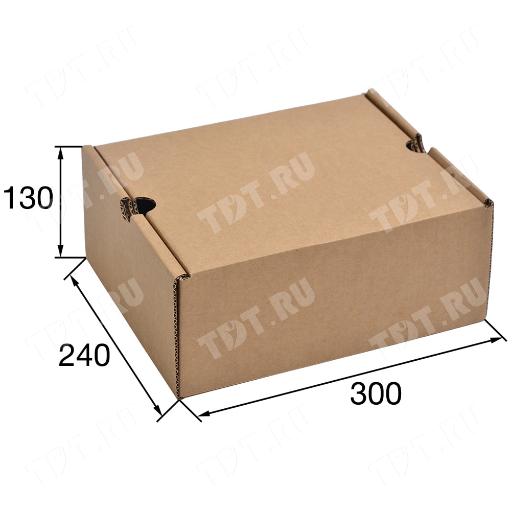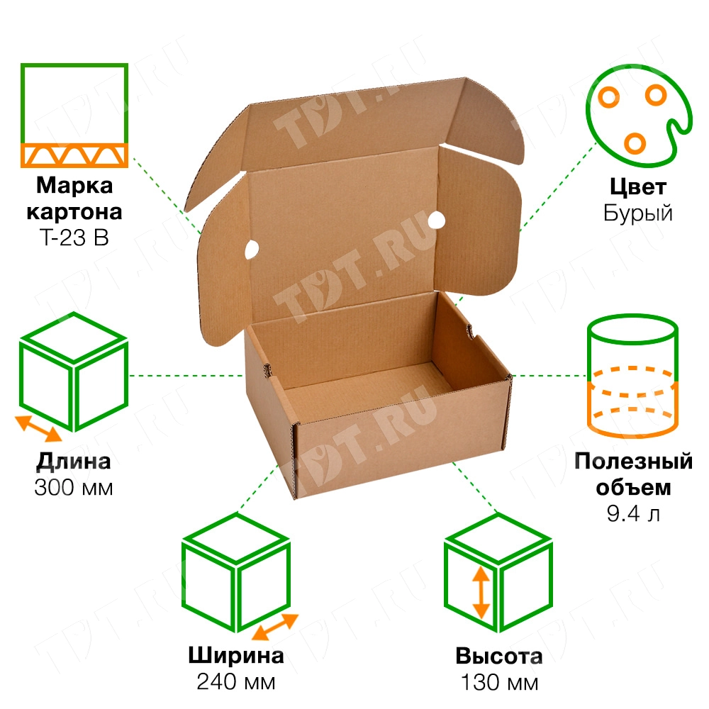 Коробка для обуви №75 бурого цвета, длиной 300 мм, шириной 240 мм и высотой 130 мм. Изготовлена из трёхслойного гофрокартона Т-23 В. Полезный объём — 9.4 л.