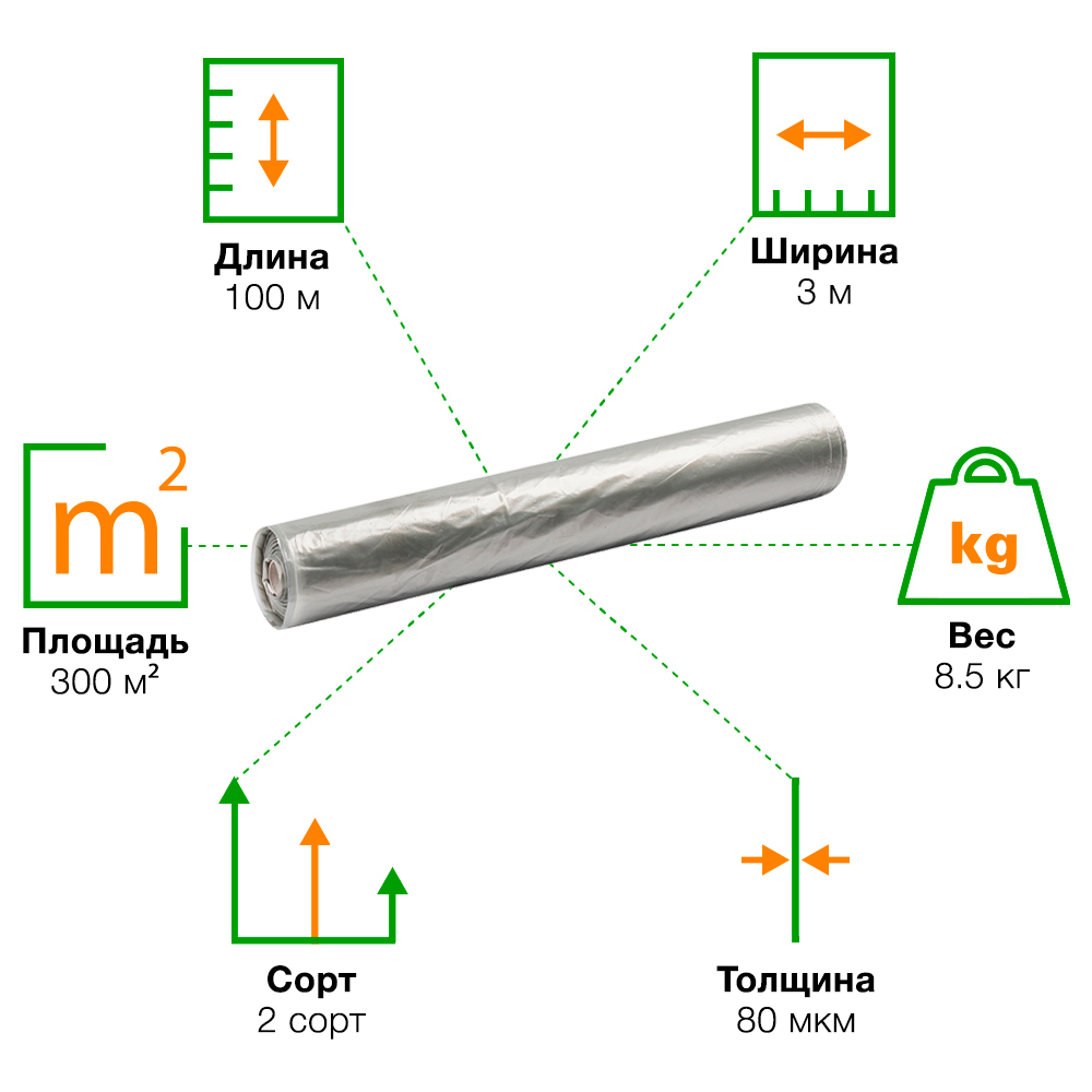 Серая полупрозрачная пленка ПВД (2 сорта) в рулоне, толщиной 80 мкм, шириной 1,5 м, длиной 100 м, общей площадью в 300 м². Пленка производится в России.