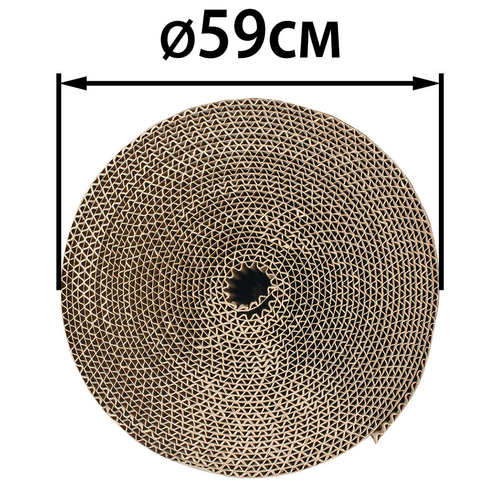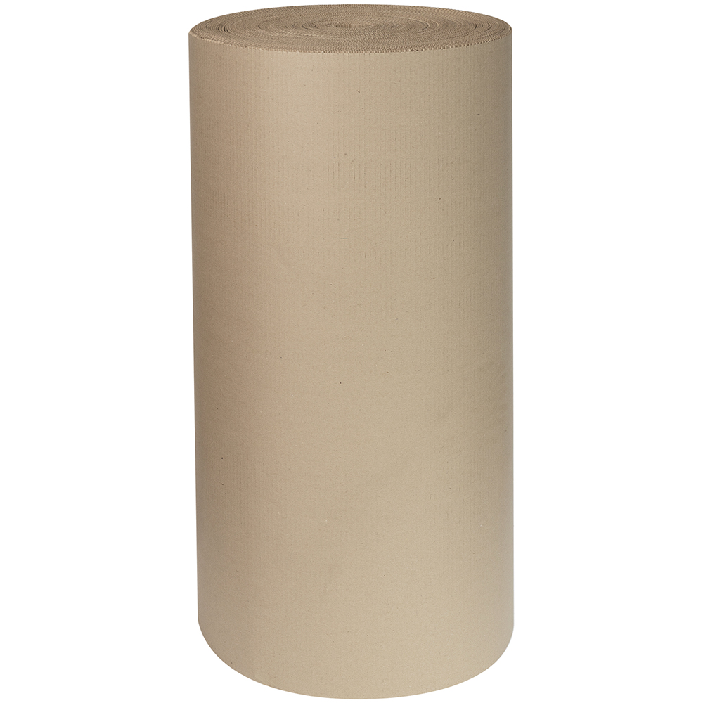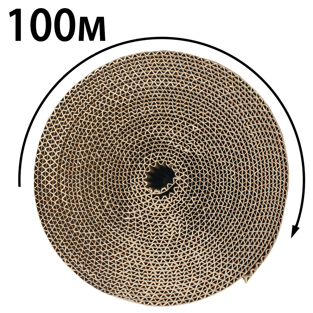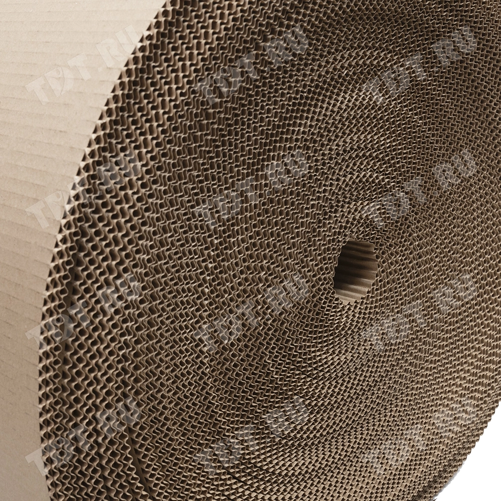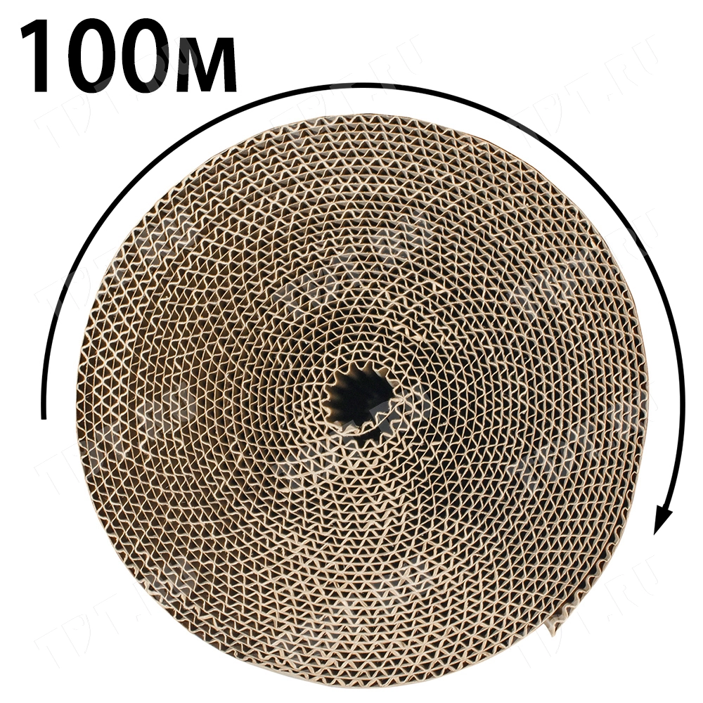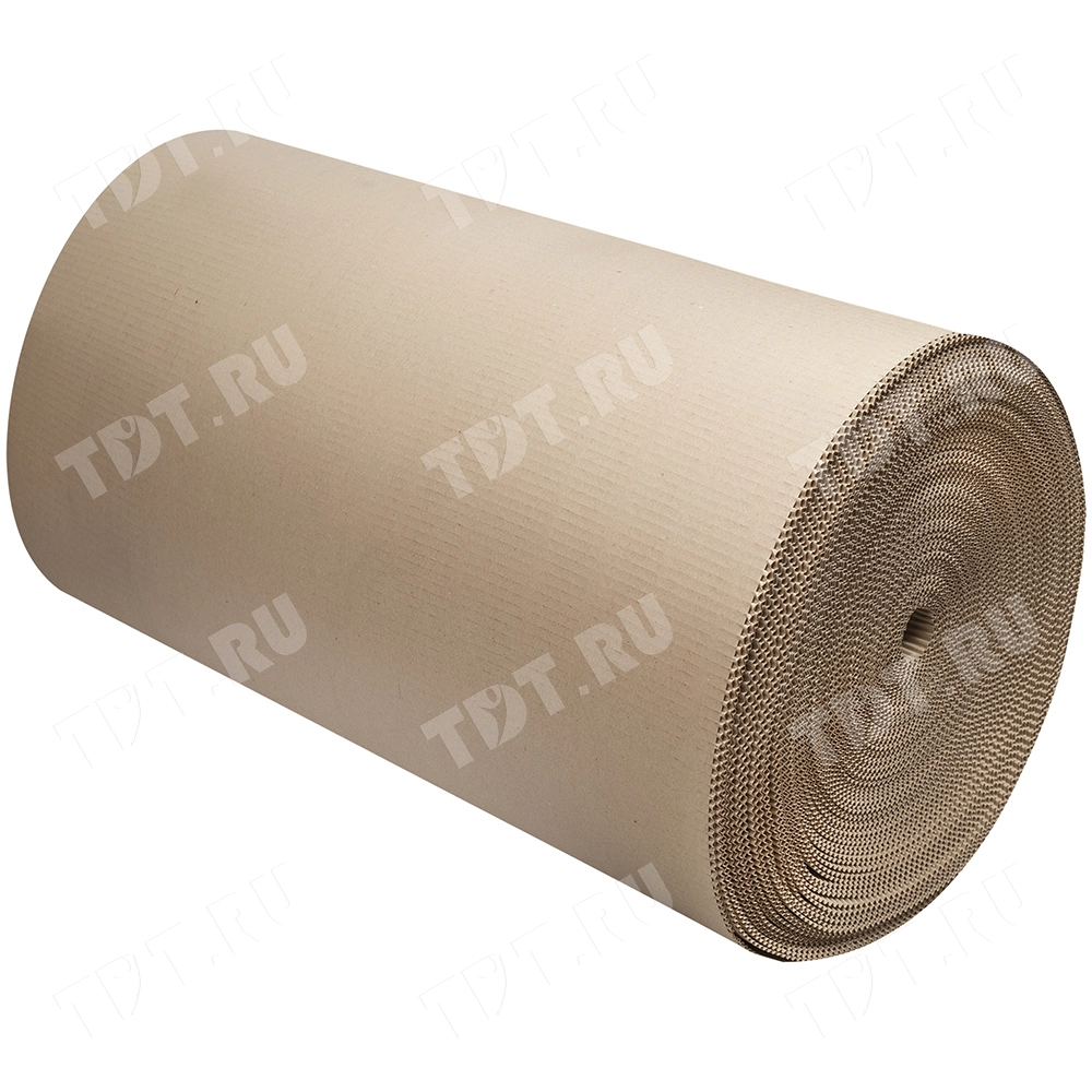 Рулонный гофрокартон бурого цвета, намоткой 100 м, шириной 1.05 м, толщиной 2.8-3.0 мм, площадью 105 м². Производится в России.