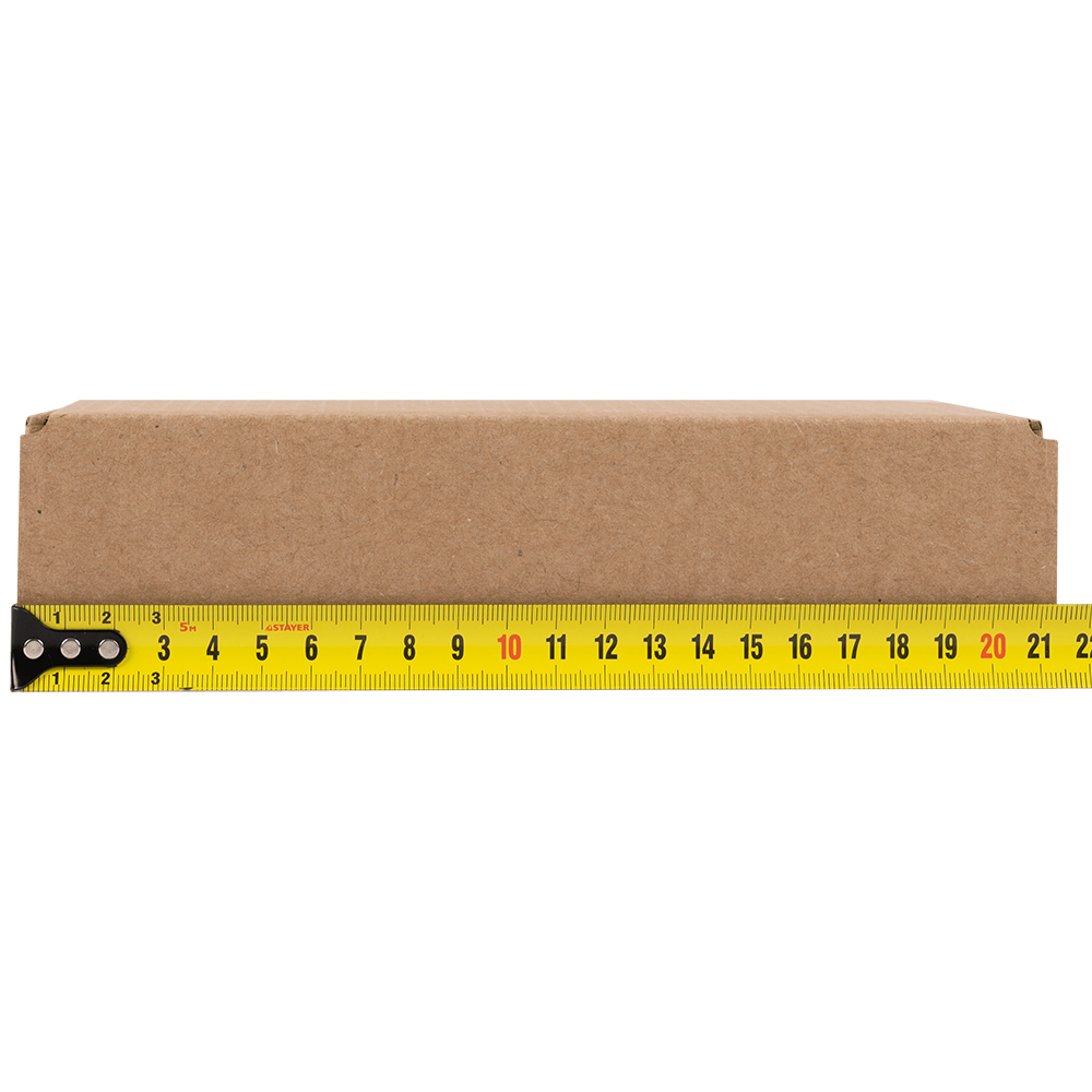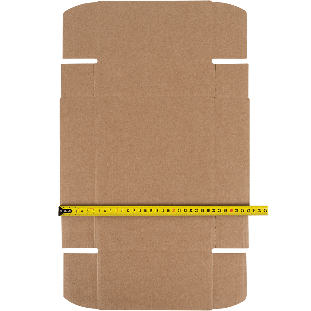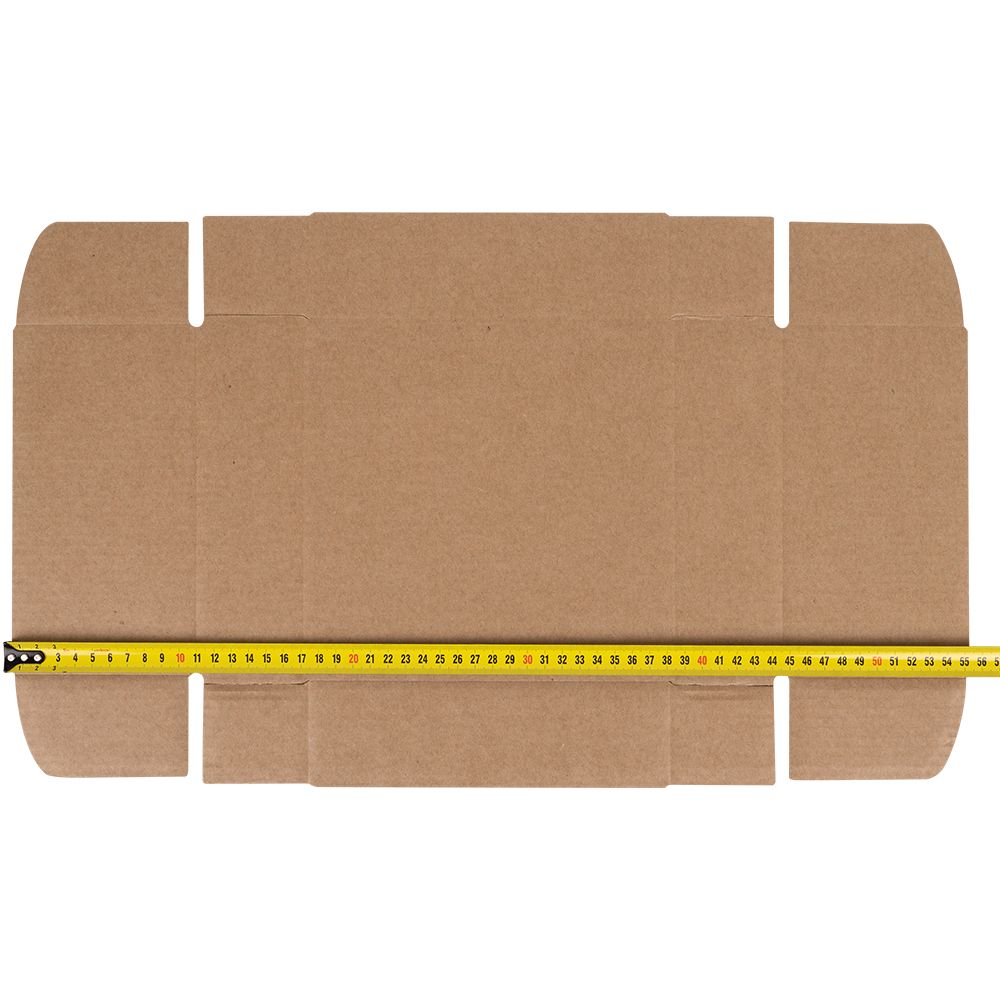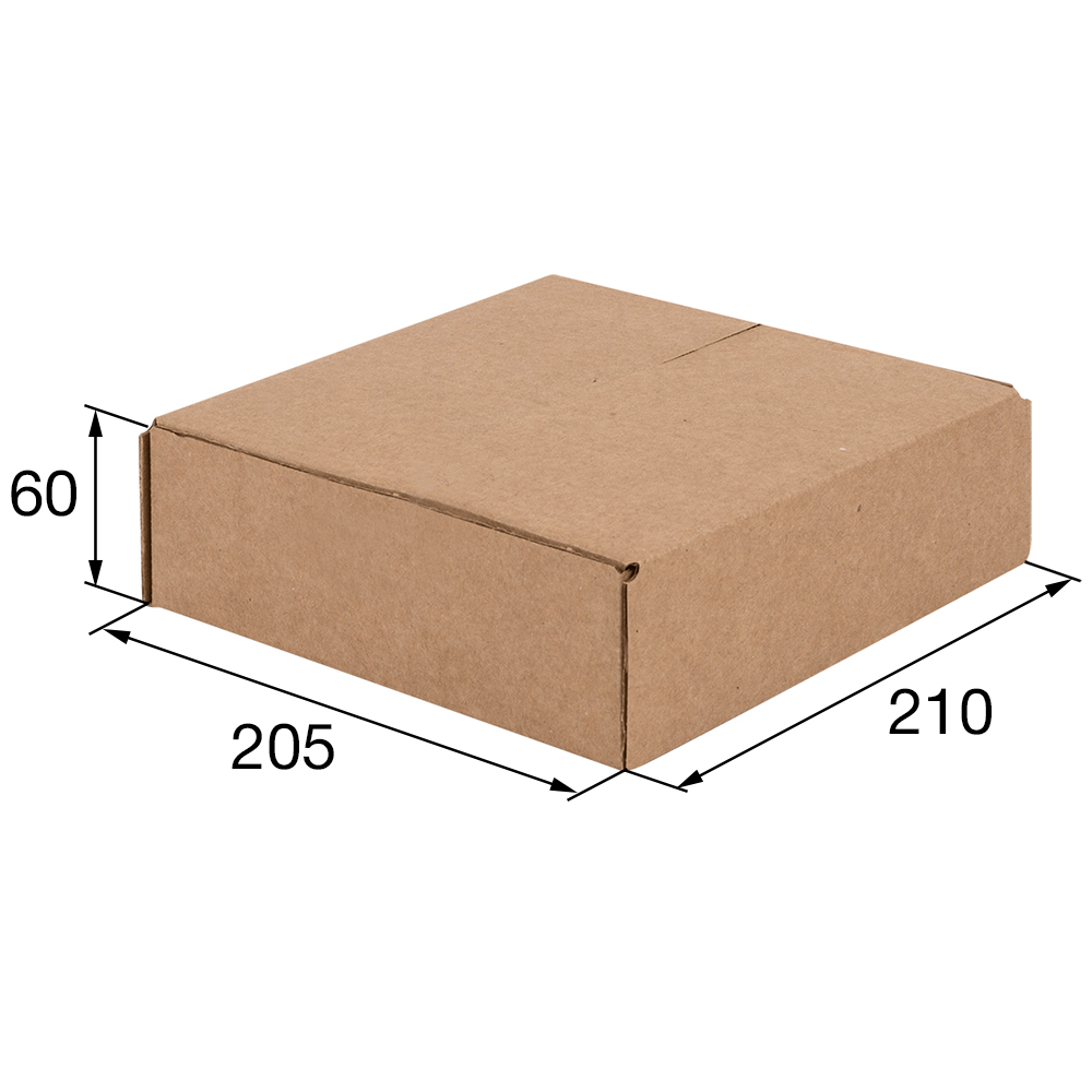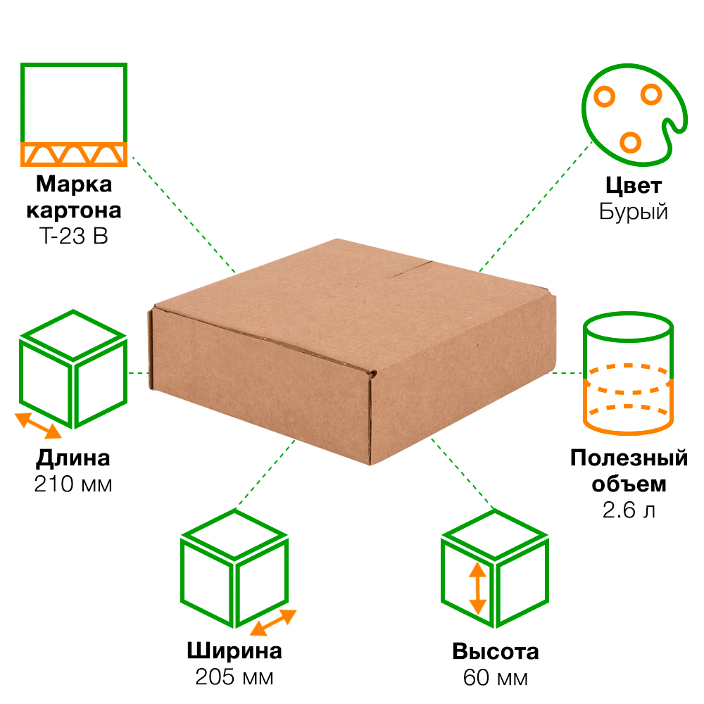 Книжный лоток №2, бурый, длиной 210 мм, шириной 205 мм и высотой 60 мм. Изготовлен из трёхслойного картона Т-23 В. Полезный объём — 2.6 л.