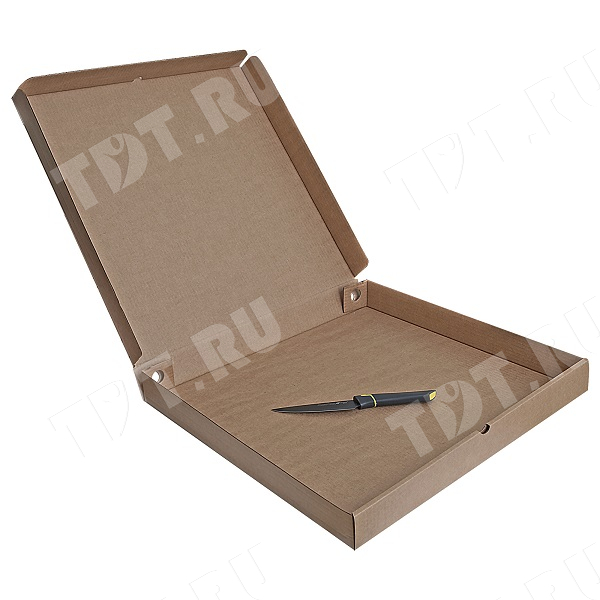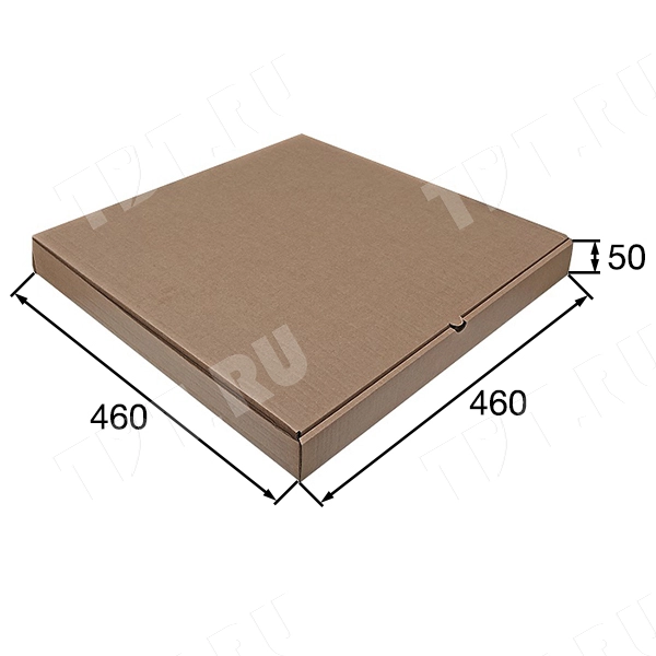 Бурая коробка для пиццы (большая), длиной 460 мм, шириной 460 мм и высотой 50 мм. Изготовлена из трехслойного картона марки Т-23. Полезный объём — 10.58 л. Производится в России.