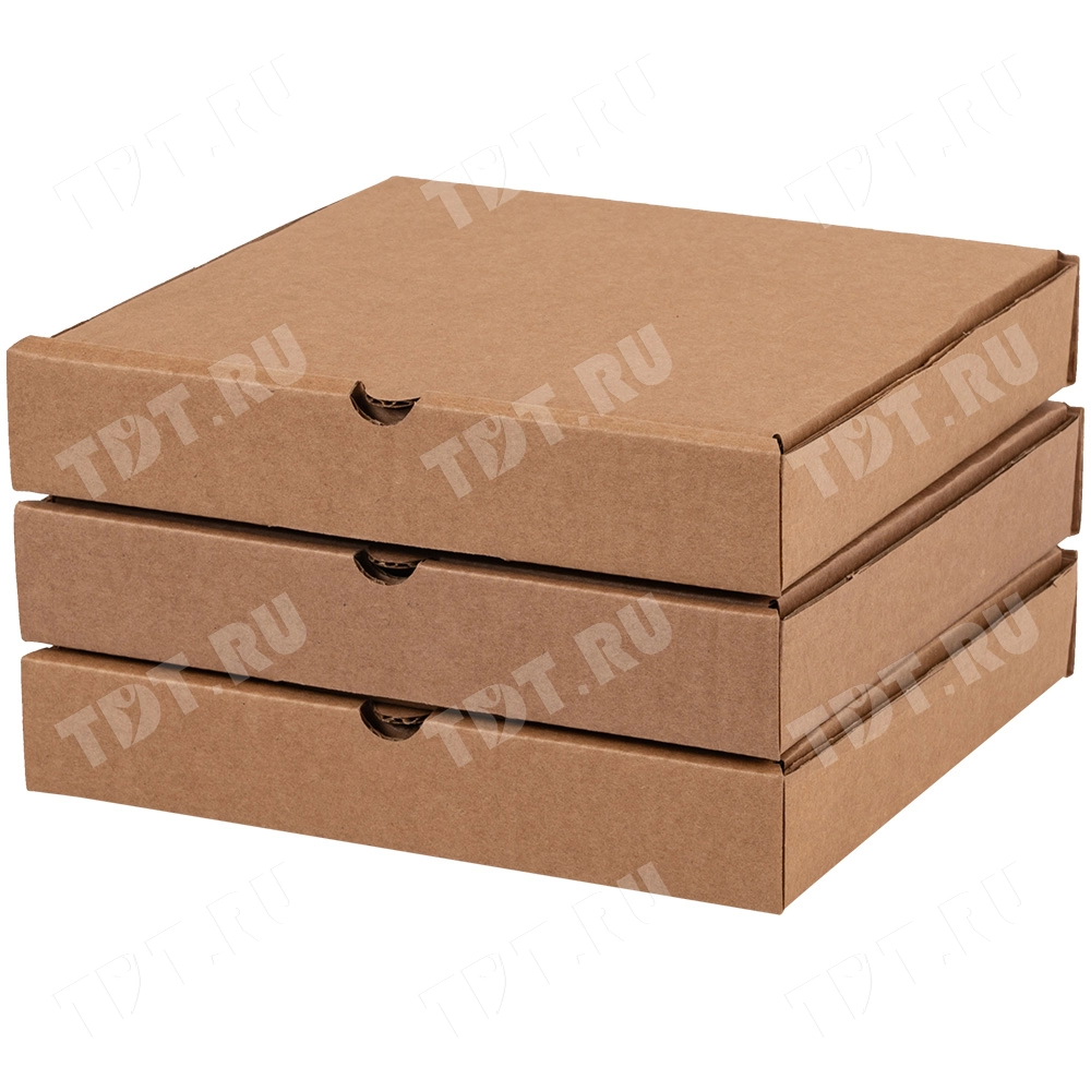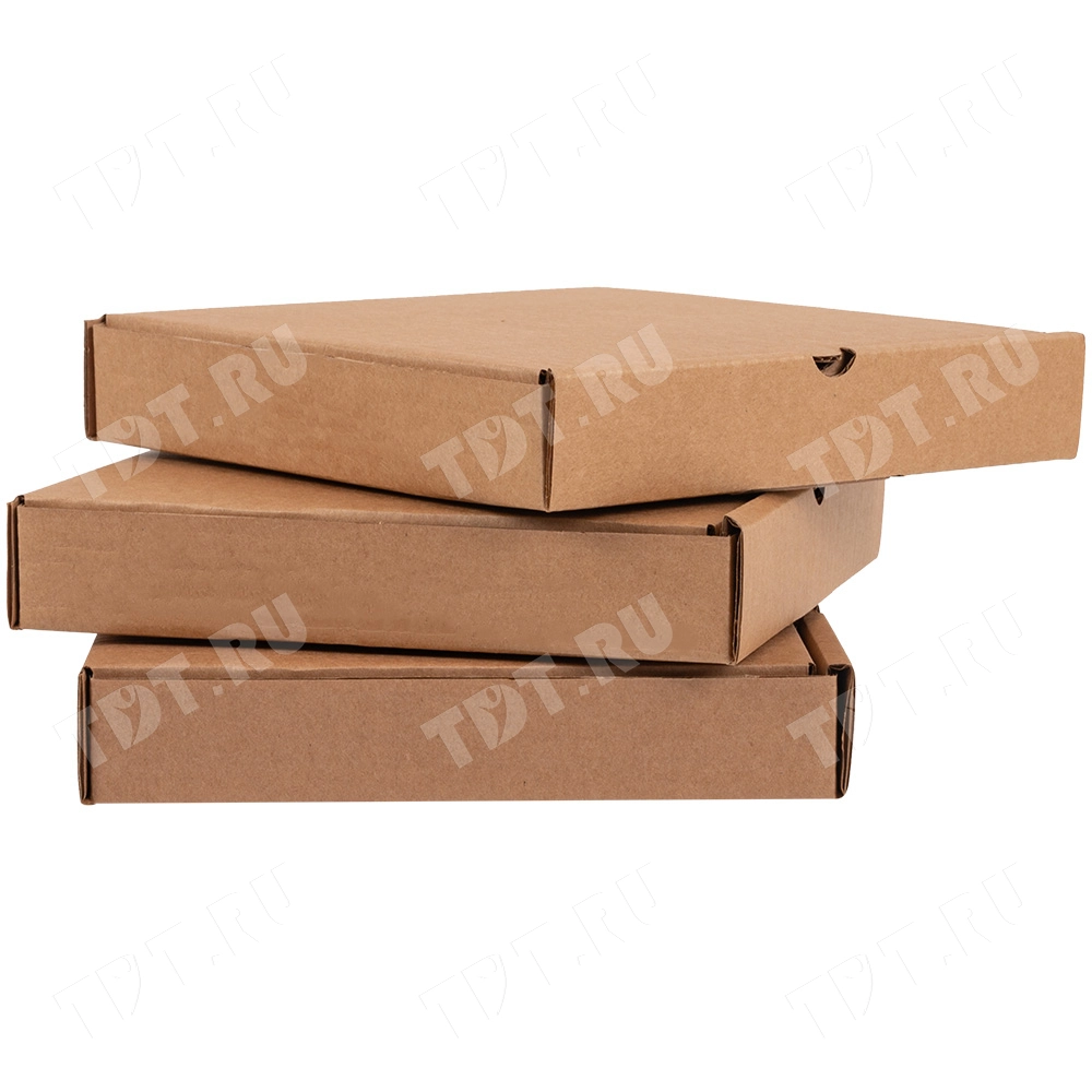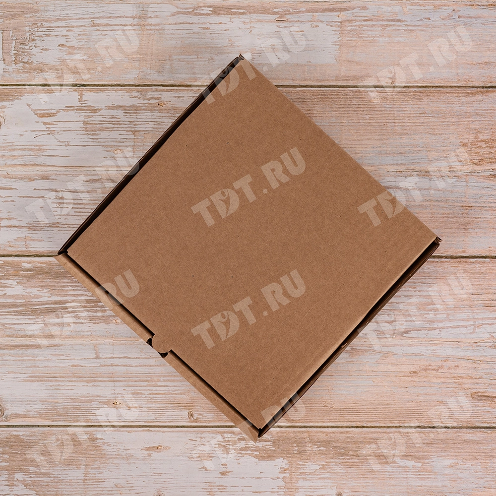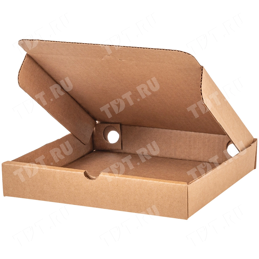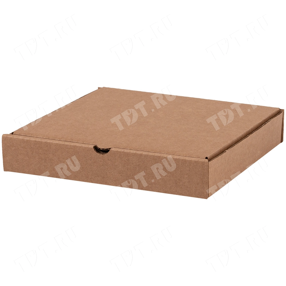 Бурая коробка для пиццы (маленькая), длиной 210 мм, шириной 210 мм и высотой 35 мм. Изготовлена из трехслойного картона марки Т-23. Полезный объём — 1.54 л. Производится в России.