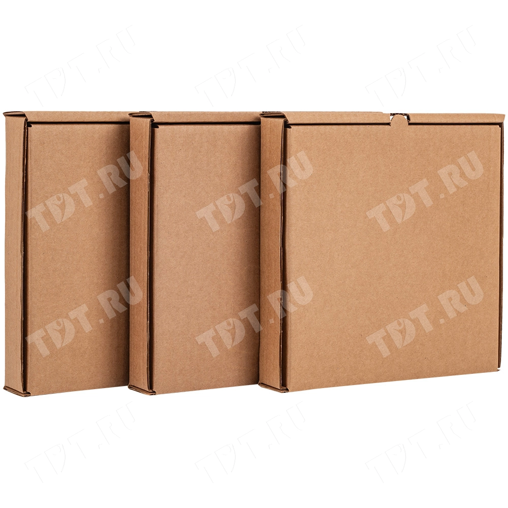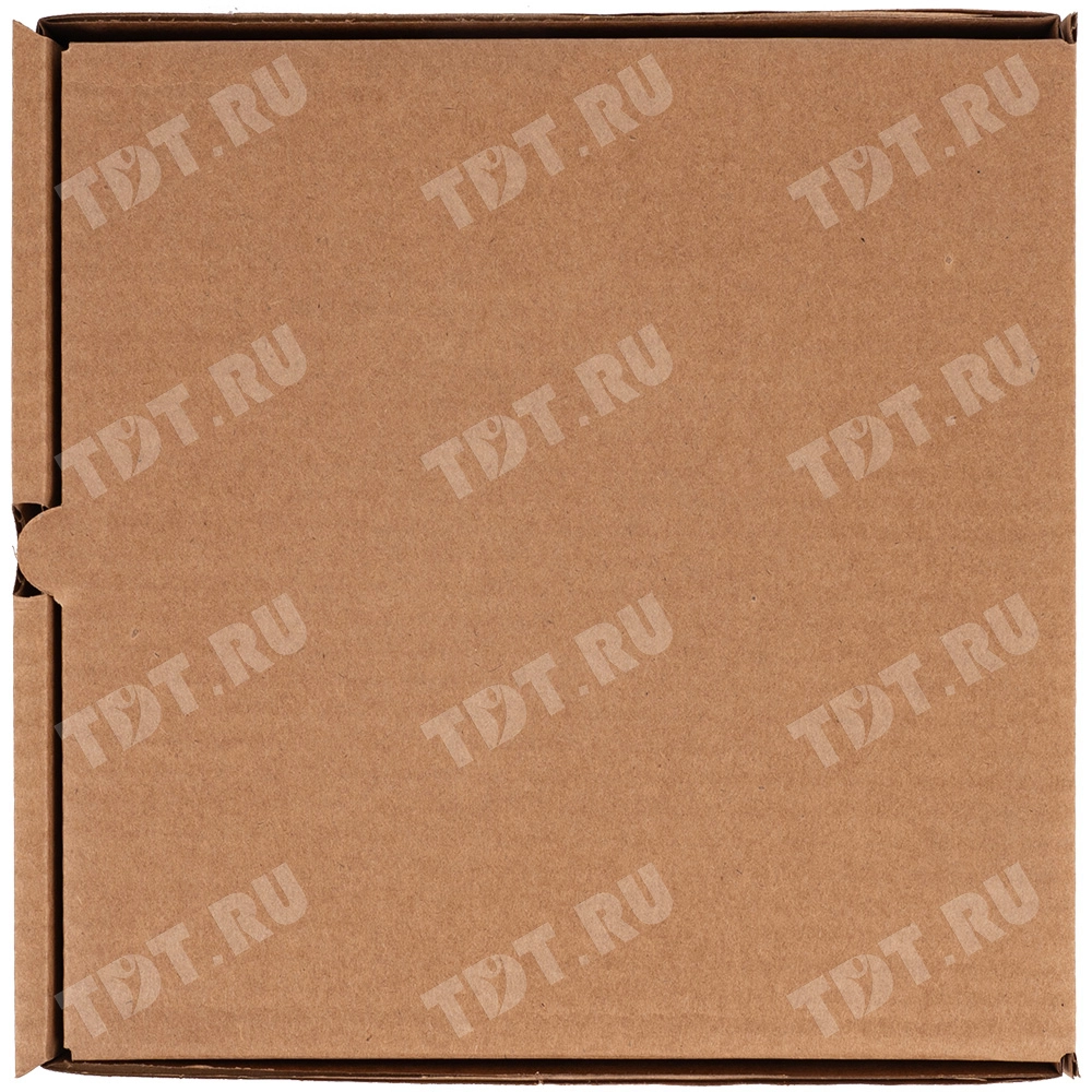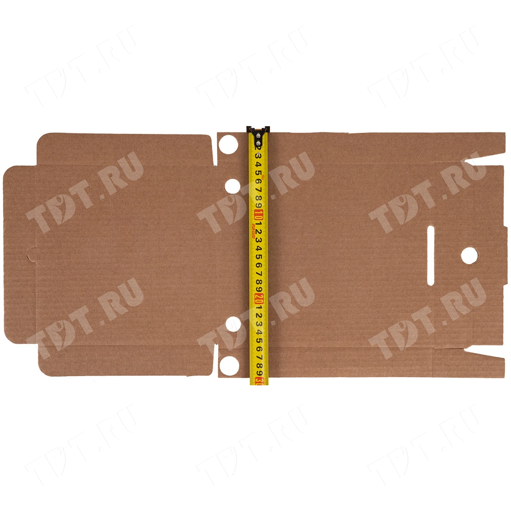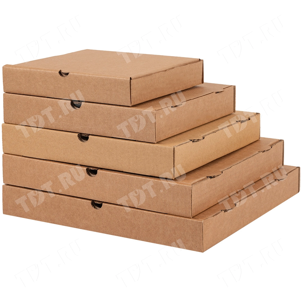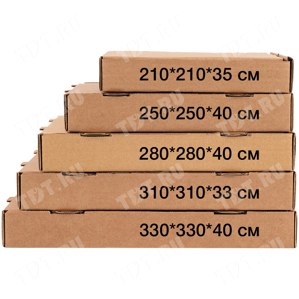 Бурая коробка для пиццы (маленькая), длиной 210 мм, шириной 210 мм и высотой 35 мм. Изготовлена из трехслойного картона марки Т-23. Полезный объём — 1.54 л. Производится в России.