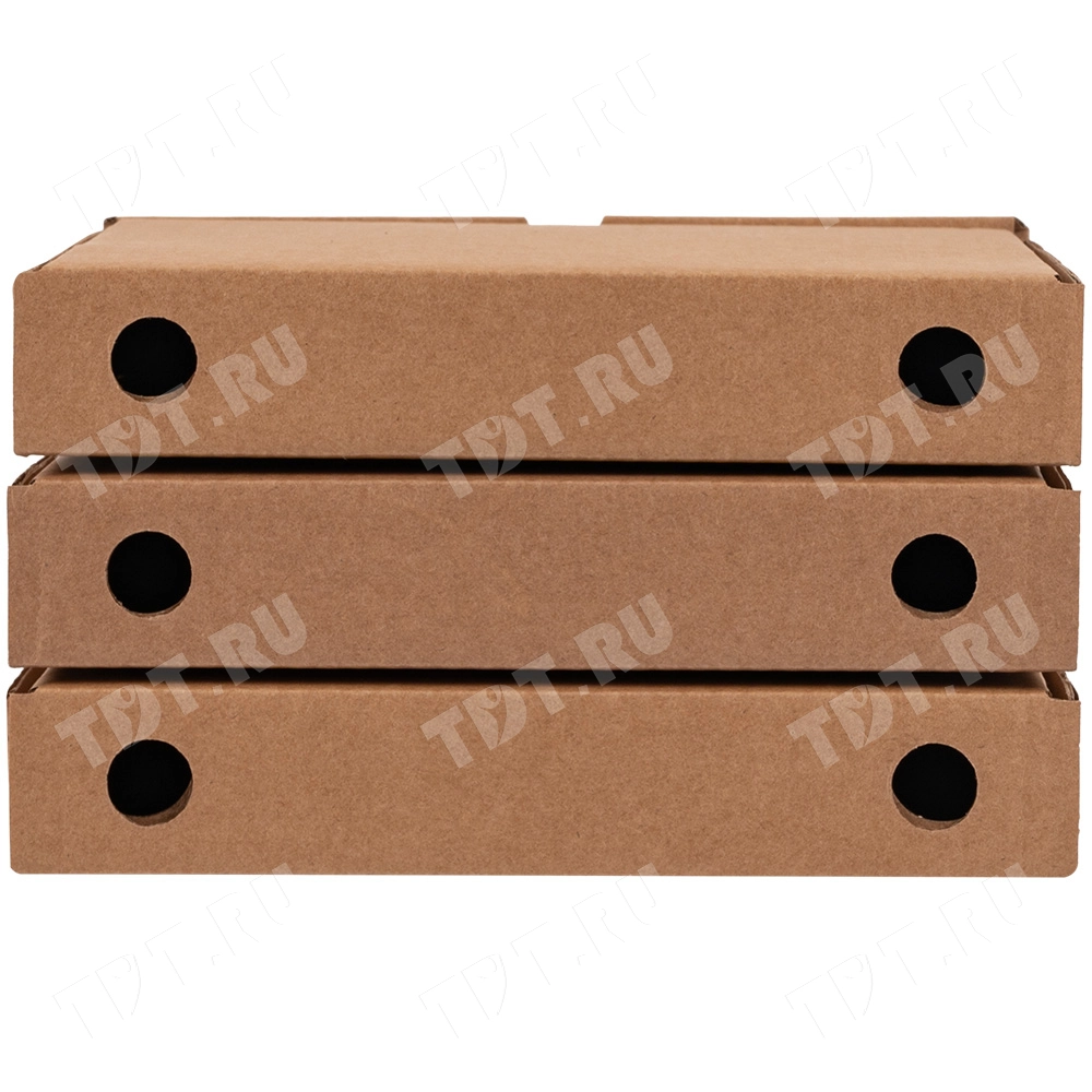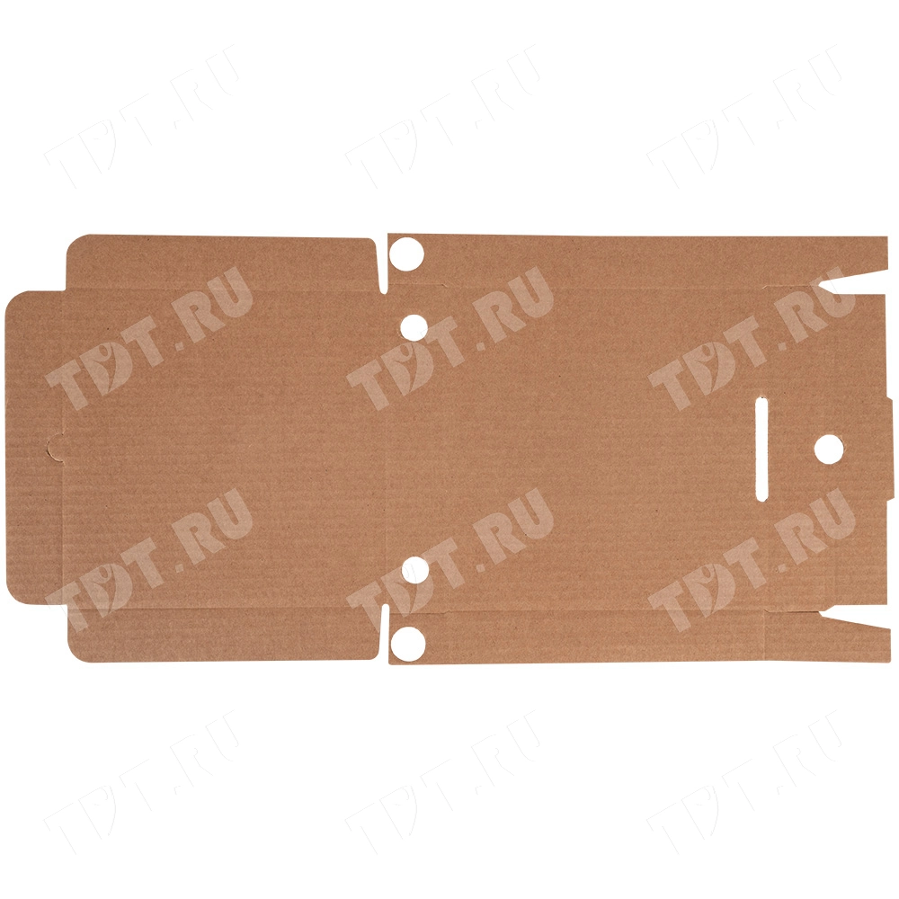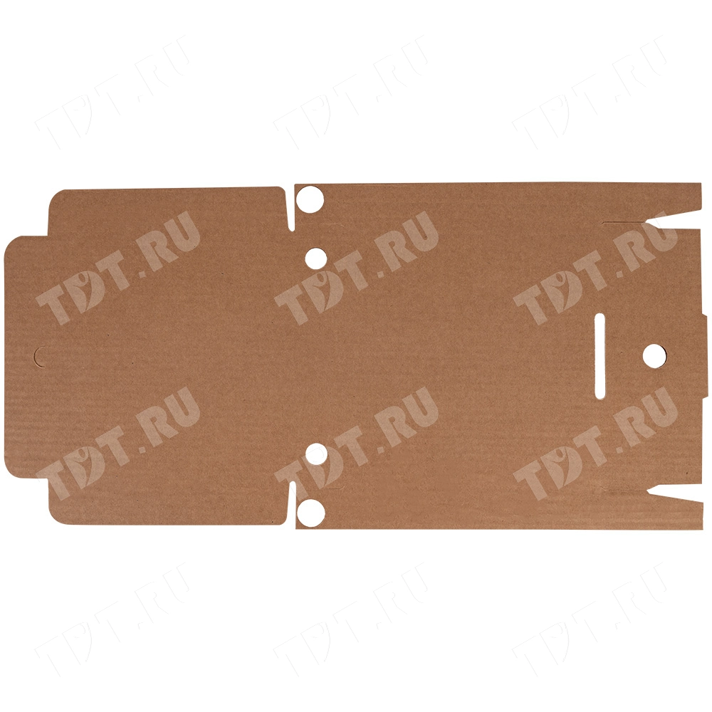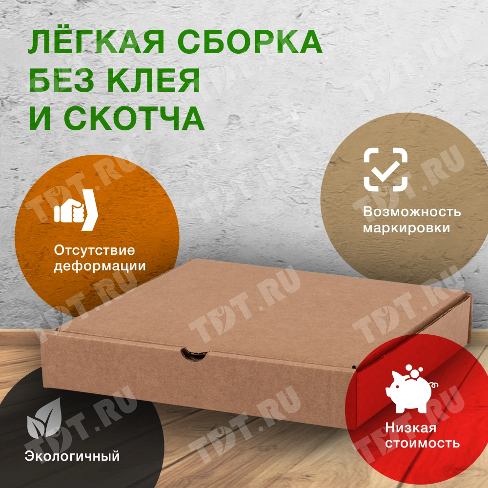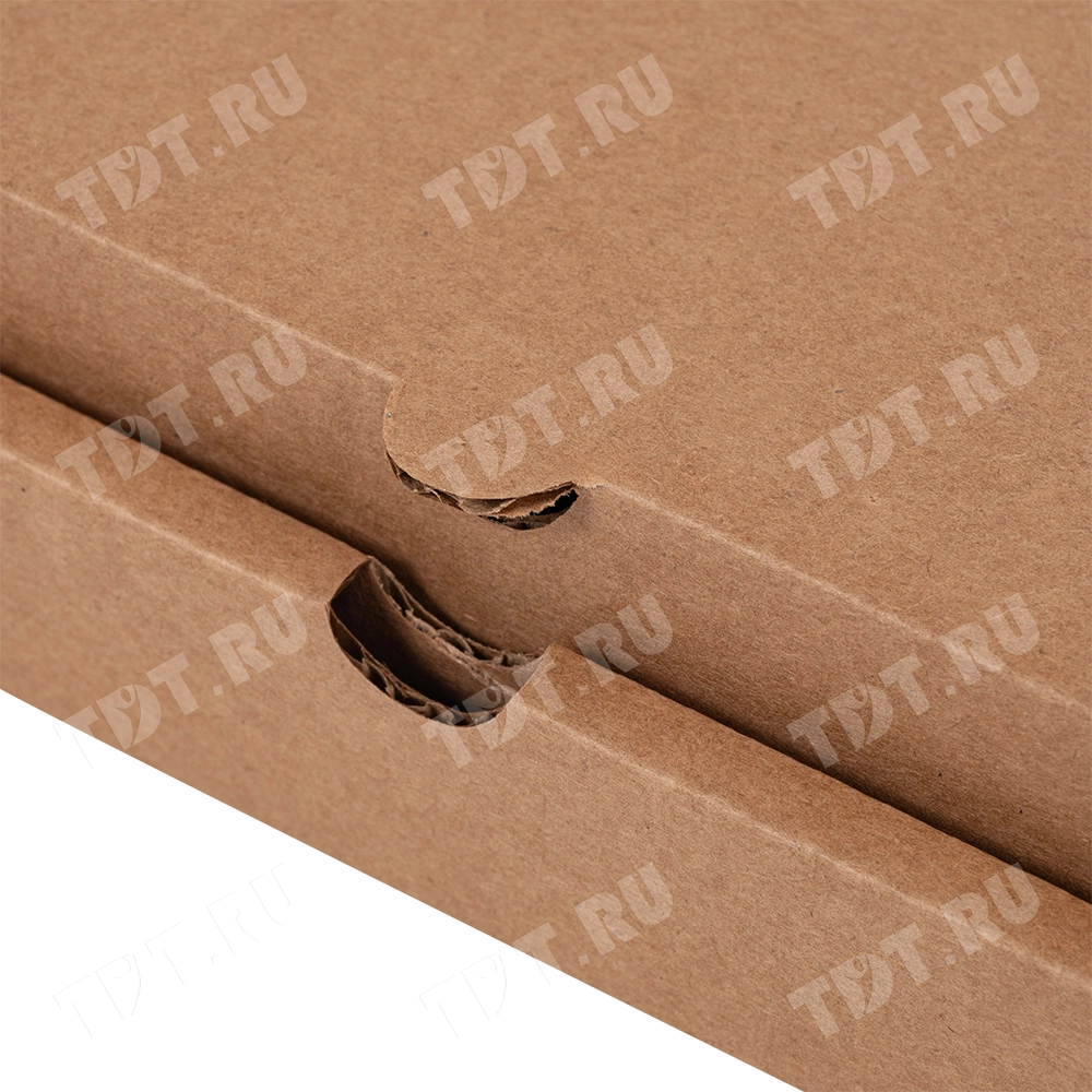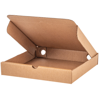 Бурая коробка для пиццы (маленькая), длиной 210 мм, шириной 210 мм и высотой 35 мм. Изготовлена из трехслойного картона марки Т-23. Полезный объём — 1.54 л. Производится в России.