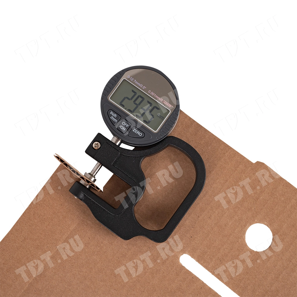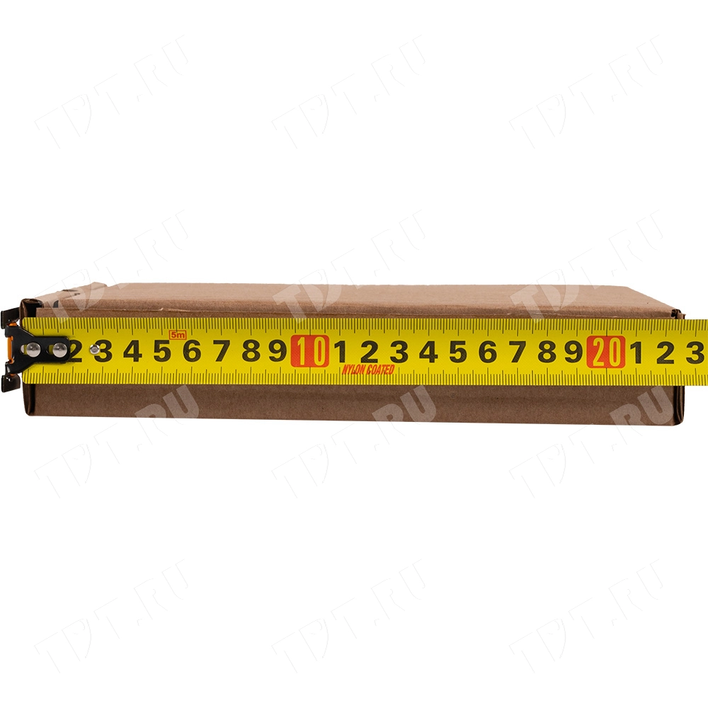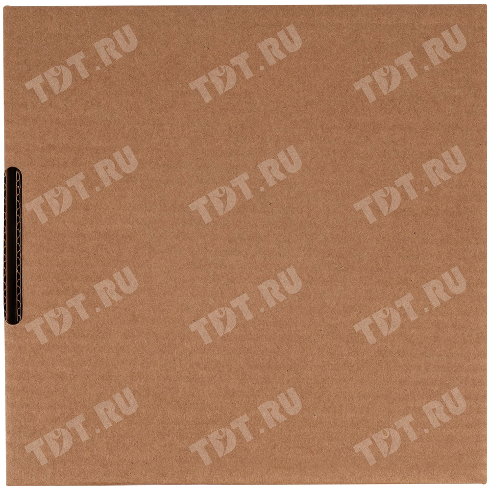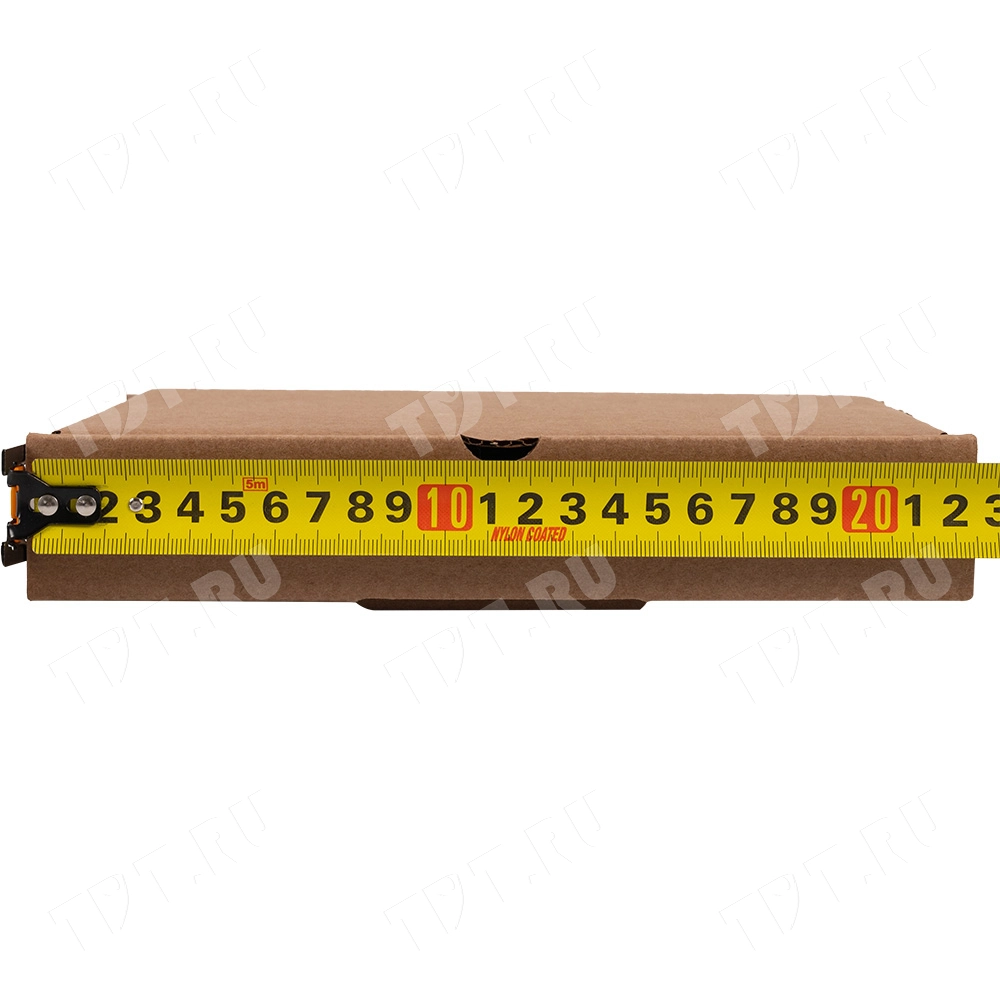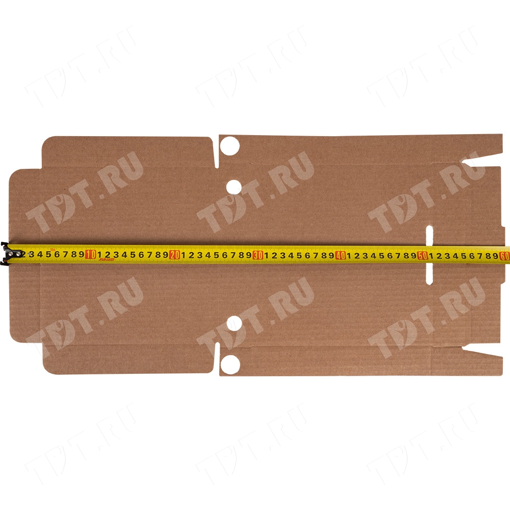 Бурая коробка для пиццы (маленькая), длиной 210 мм, шириной 210 мм и высотой 35 мм. Изготовлена из трехслойного картона марки Т-23. Полезный объём — 1.54 л. Производится в России.