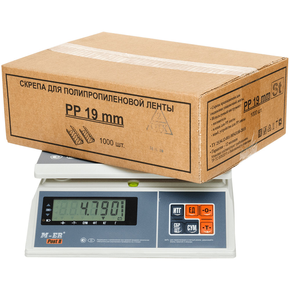 Металлические скобы для полипропиленовых лент (ПП), шириной 19 мм, толщиной 0.5 мм, в упаковке по 1000 шт, весом 4.79 кг, транспортировочным объемом 0.006348 м³. Скобы подходят для лент шириной 19 мм. Производятся в России.