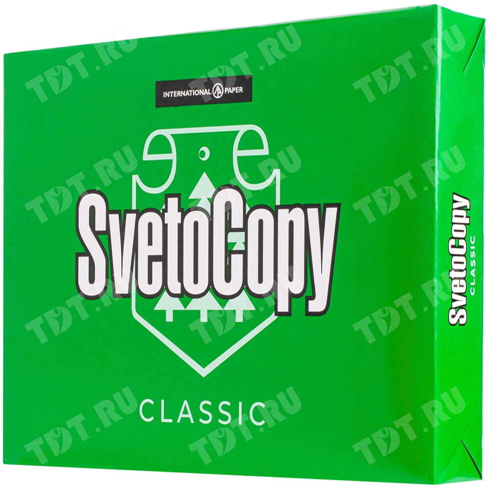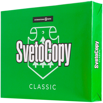 Офисная бумага SvetoCopy Classic (белого цвета), формата А3, диной 420 мм, шириной 297 мм, классом бумаги C, плотностью бумаги 80 г/м², толщиной 104 мкм, белизной 146%, непрозрачностью 91%, в упаковке по 500 штук, весом 4.924 кг. Производится в России.