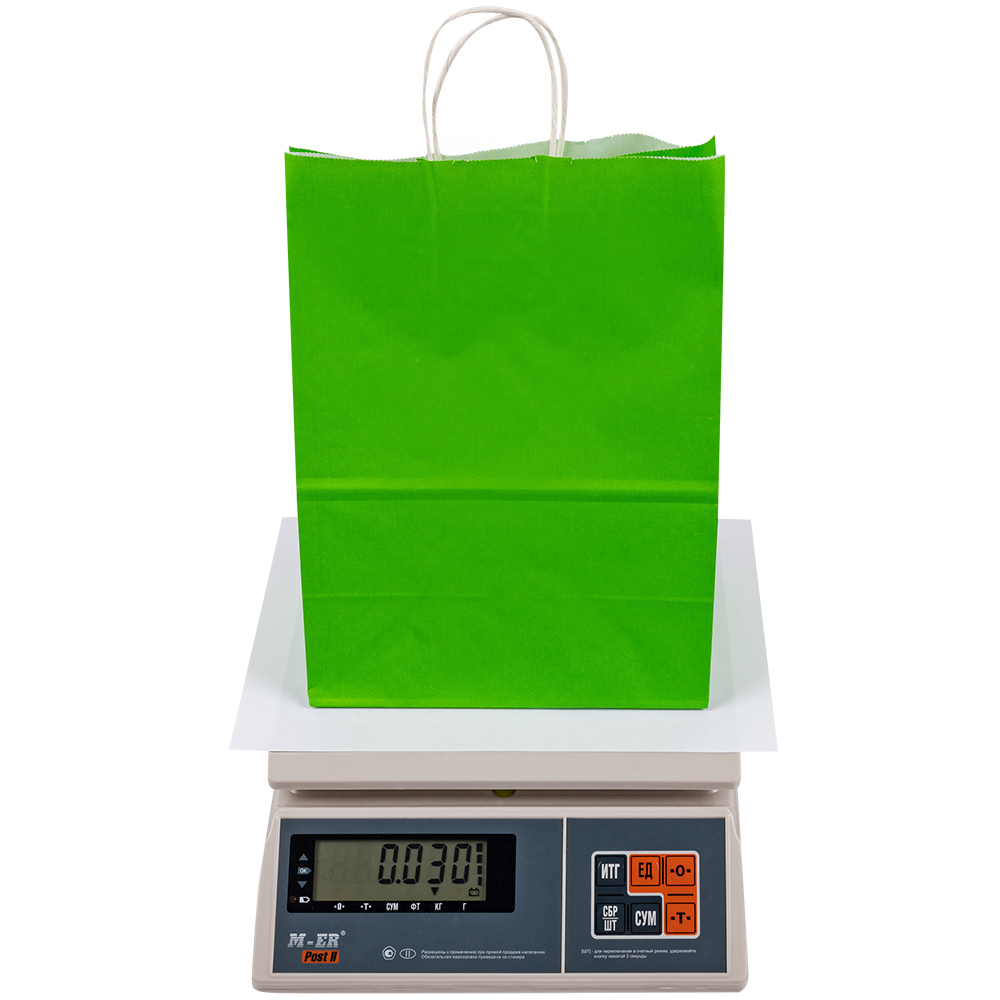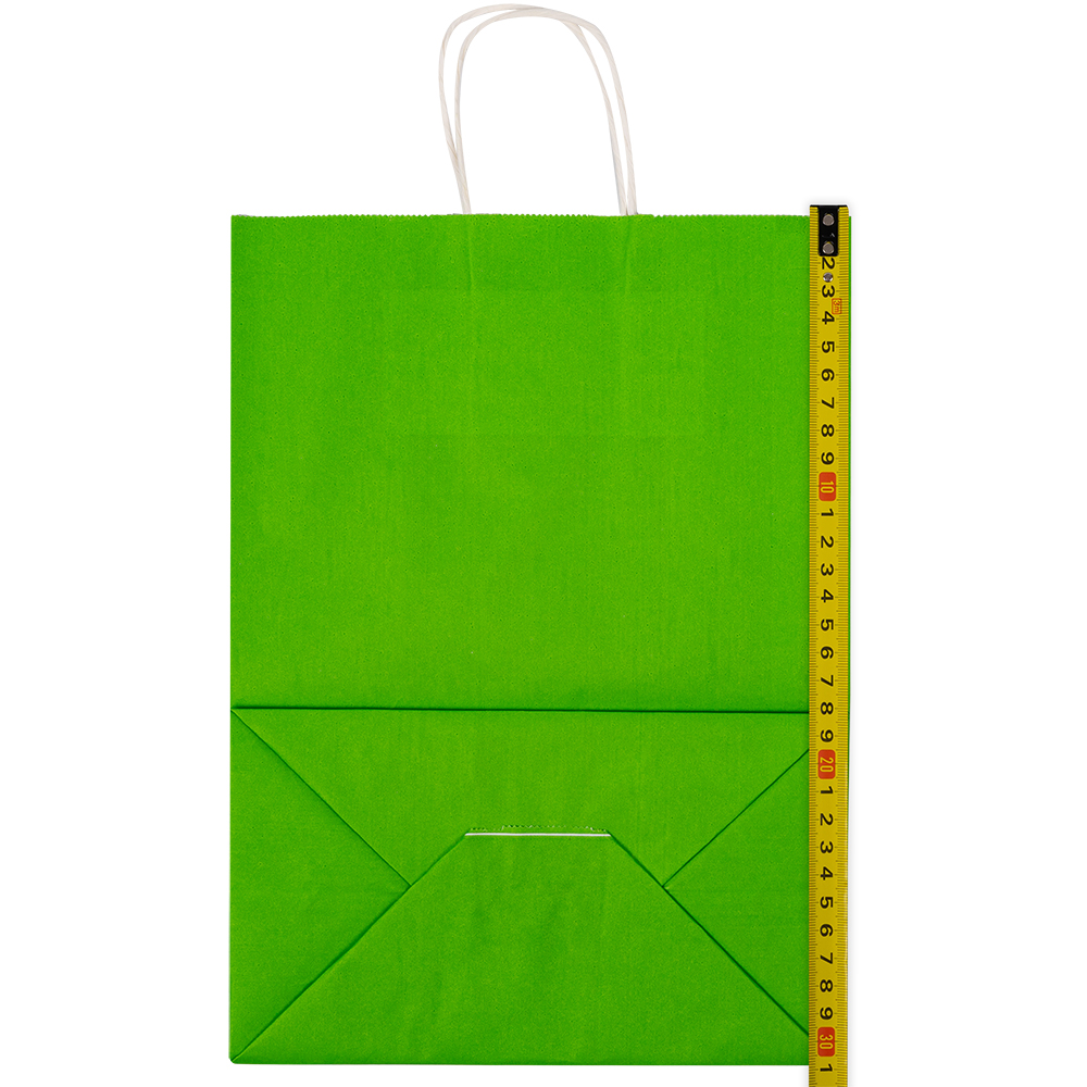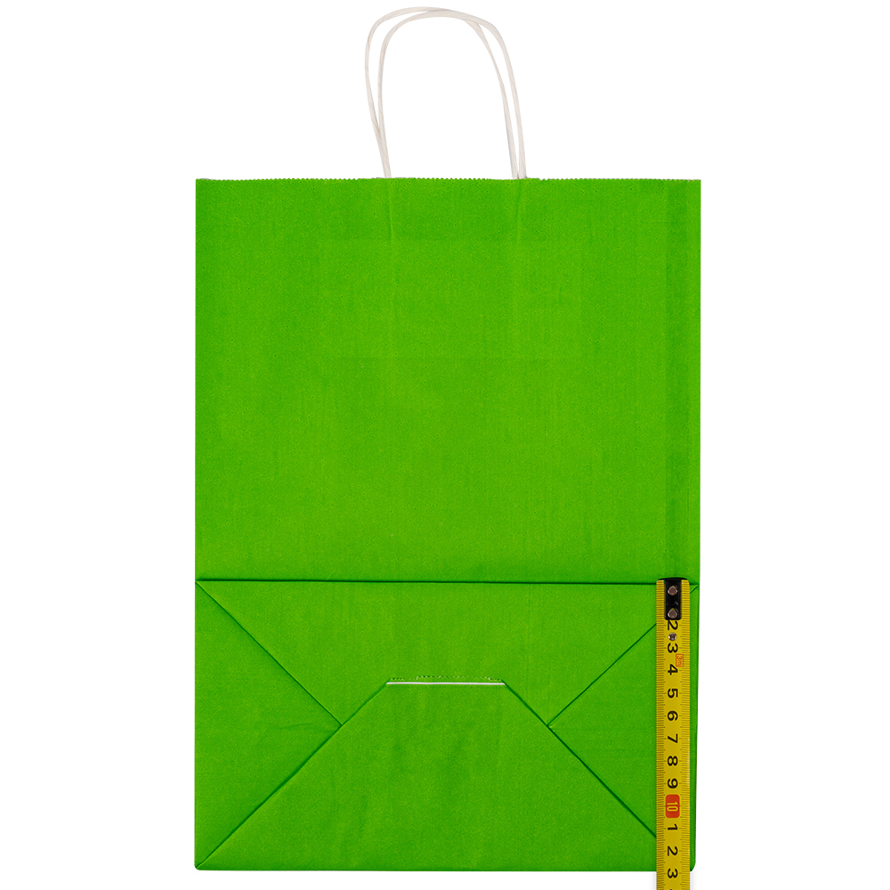 Зеленый бумажный крафт пакет с крученой ручкой шириной 110 мм, длиной 250 мм, высотой 320 мм изготовлен из экологичного материала. Пакеты производятся в России.