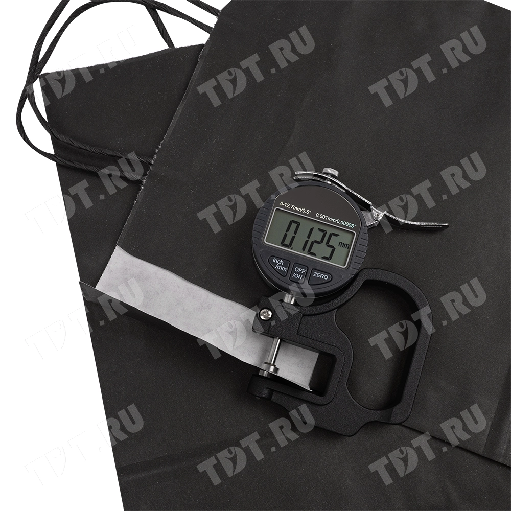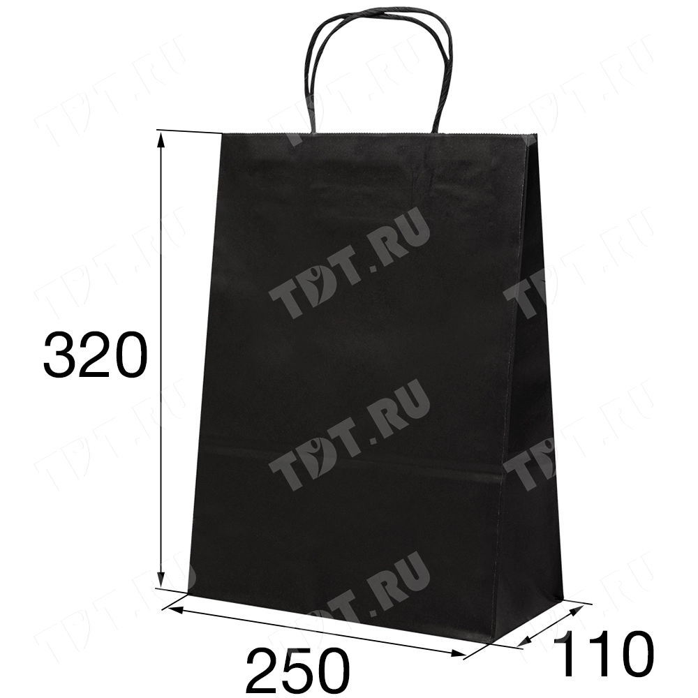 Чёрный бумажный крафт пакет с крученой ручкой шириной 110 мм, длиной 250 мм, высотой 320 мм изготовлен из экологичного материала. Пакеты производятся в России.