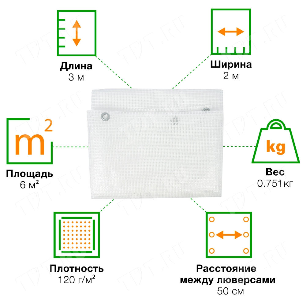 Армированная пленка (тент) из полиэтилена с люверсами – сетка ламинированная пленкой длиной 3 м, шириной 2 м, площадью 6 м², плотностью 120 г/м². Применяется: на стройке, при ремонтных работах и в сельском хозяйстве. Армированный каркас распределят нагрузку равномерно по всему полотну, за счет чего происходит меньшее число разрывов по сравнению с обычным ПЭ.