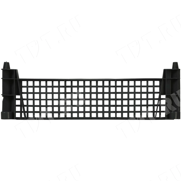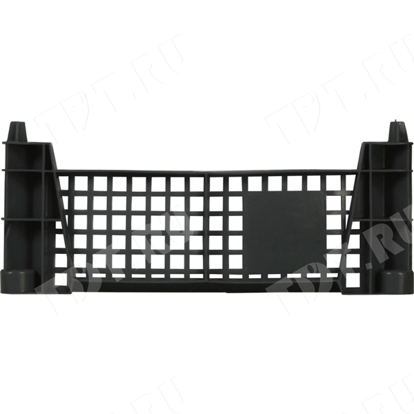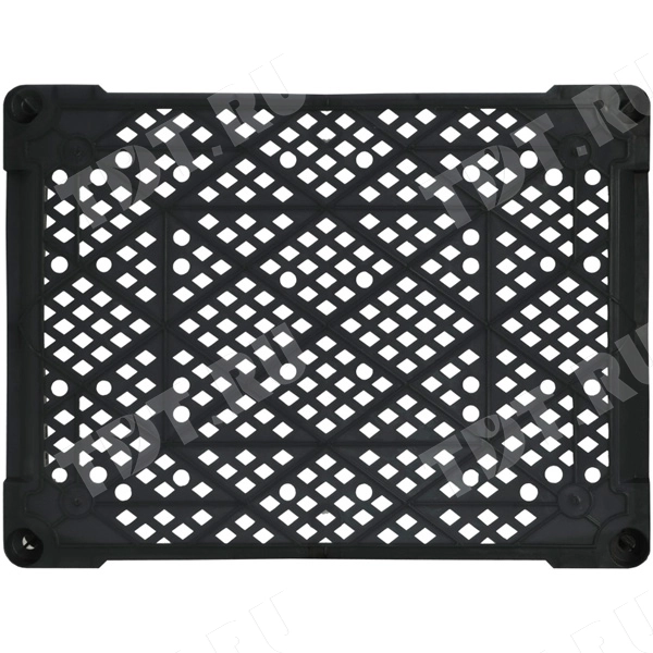 Пластиковый ящик черного цвета для хранения и транспортировки грибов, ягод, овощей, фруктов длиной 400 мм, шириной 300 мм, высотой 110 мм. Изготовлен из полипропилена. Производится в России.