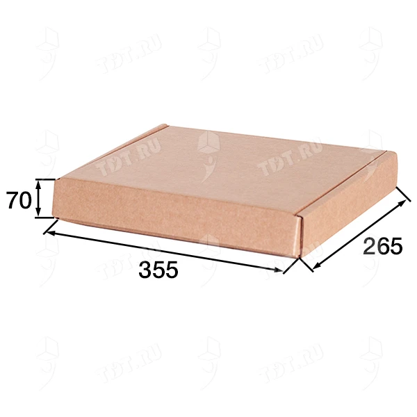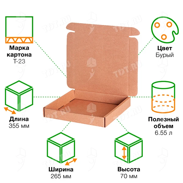 Короб КС-270, бурый, длиной 355 мм, шириной 265 мм и высотой 70 мм. Изготовлен из трёхслойного картона Т-23. Полезный объём — 6.55 л.