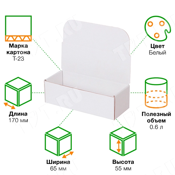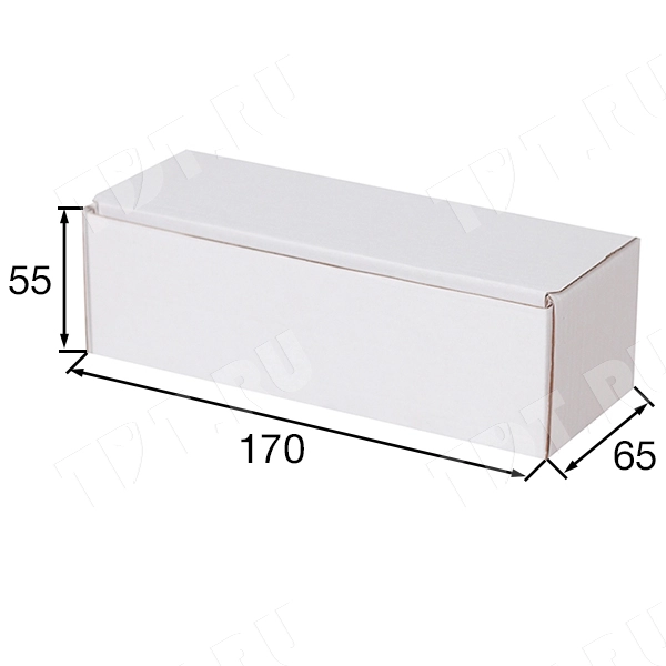Короб КС-408 МГФ, серии КС-400, белый, длиной 170 мм, шириной 65 мм и высотой 55 мм. Изготовлен из микрогофрокартона Т-23. Полезный объём — 0.6 л.