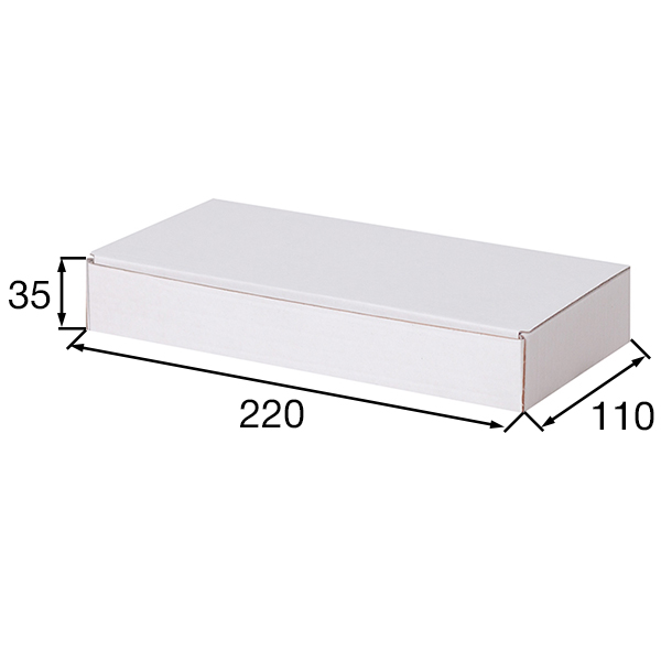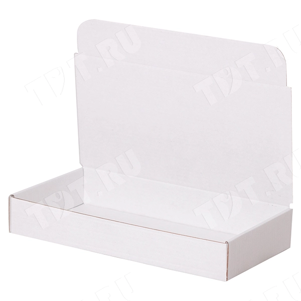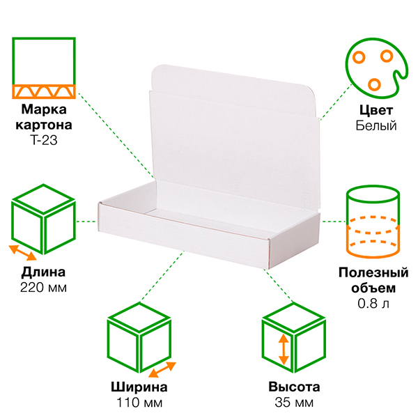 Короб КС-412 МГФ, серии КС-400, белый, длиной 220 мм, шириной 110 мм и высотой 35 мм. Изготовлен из микрогофрокартона Т-23. Полезный объём — 0.8 л.