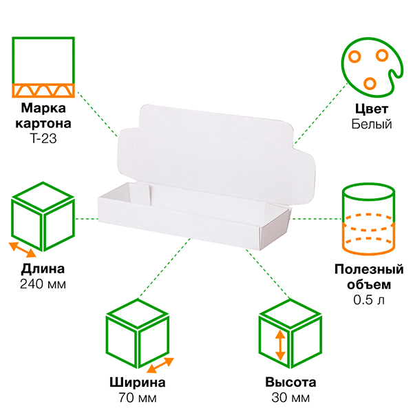Короб КС-416 МГФ, серии КС-400, белый, длиной 240 мм, шириной 70 мм и высотой 30 мм. Изготовлен из микрогофрокартона Т-23. Полезный объём — 0.5 л.