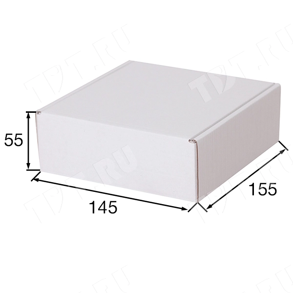 Короб КС-420 МГФ, серии КС-400, белый, длиной 145 мм, шириной 155 мм и высотой 55 мм. Изготовлен из микрогофрокартона Т-23. Полезный объём — 1.2 л.