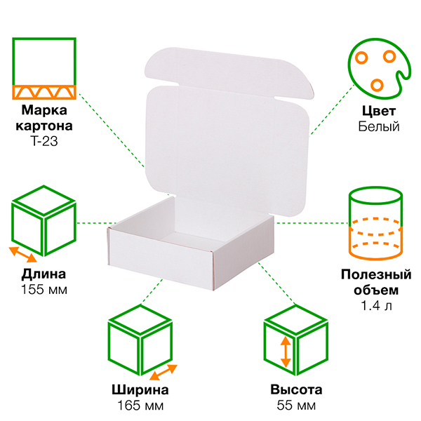 Короб КС-422 МГФ, серии КС-400, белый, длиной 155 мм, шириной 165 мм и высотой 55 мм. Изготовлен из микрогофрокартона Т-23. Полезный объём — 1.4 л.