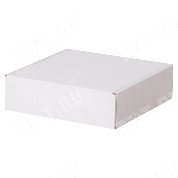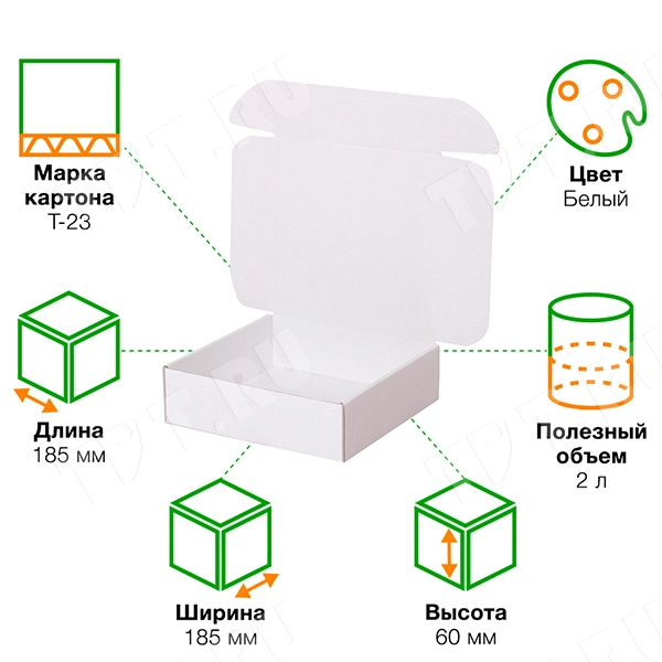 Короб КС-426 МГФ, серии КС-400, белый, длиной 185 мм, шириной 185 мм и высотой 60 мм. Изготовлен из микрогофрокартона Т-23. Полезный объём — 2 л.