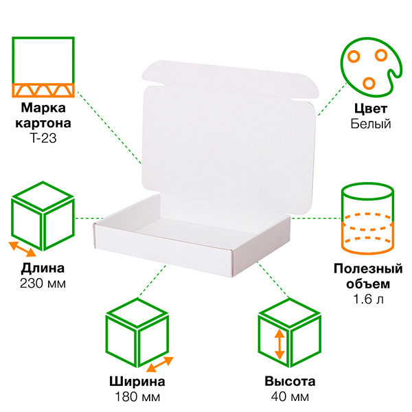 Короб КС-429 МГФ, серии КС-400, белый, длиной 230 мм, шириной 180 мм и высотой 40 мм. Изготовлен из микрогофрокартона Т-23. Полезный объём — 1.6 л.