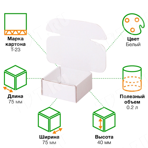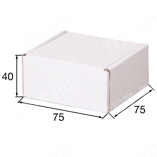 Короб КС-433 МГФ, серии КС-400, белый, длиной 75 мм, шириной 75 мм и высотой 40 мм. Изготовлен из микрогофрокартона Т-23. Полезный объём — 0.2 л.