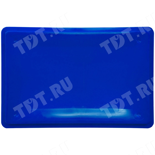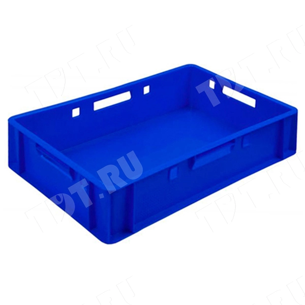 Сплошной пластиковый ящик синего цвета с четырьмя ручками для хранения и транспортировки мяса, колбас и мясной продукции длиной 600 мм, шириной 400 мм, высотой 120 мм. Изготовлен из полиэтилена. Производится в России.