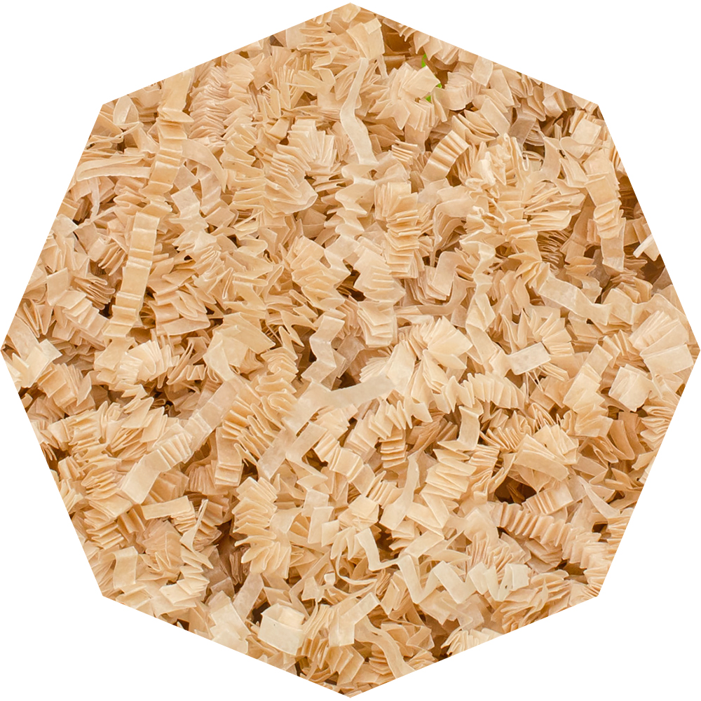 Бумажный подарочный наполнитель «Пергамент небеленый» из простой бумаги, цвета пергамент небеленый, весом 1 кг, плотностью 80 г/м², шириной резки 2-3 мм. Производится в России.